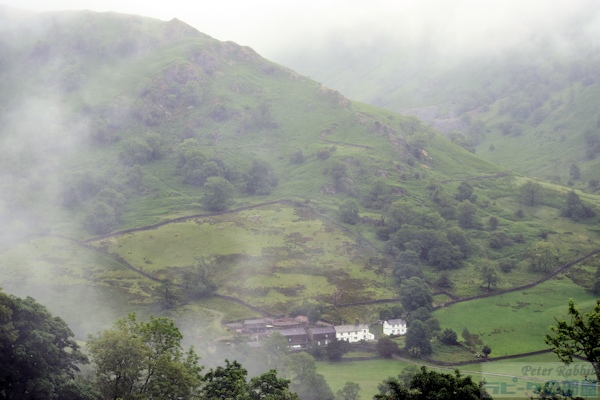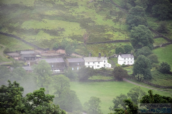 ▼牧場経営のターニングポイントとなったトラウトベック・パーク農場 湖水地方に滞在し3日目の朝(旅は4日目)を迎えました。2日目の朝は、朝食リクエストを前日の夜までに出し忘れ慌てましたが、3日目はじっくりメニューを選んでリクエストしたので、朝から盛りだくさんです。 ![]() ベーコン、マッシュルーム、ベイクドビーンズ、グリルトマト、スクランブルエッグ、ヨーグルト、ジュース、コーヒー、パン。パンは、ホワイトかもしくはブラウン、それともその両方のミックスと選択できました。 天気は今にも雨が降りだしそうな曇り空の中、最初の目的地のトラウトベック・パーク農場へ向かいました。ボウネスの宿から車で約20分ほどでした。 この農場は、ビアトリクスが1923年、57歳の時に、敷地約1900エーカー(東京ドーム164個分)を取得し、湖水地方で最大級となる農場の地主となりました。これまでは、ヒルトップ農場で農場経営のノウハウを学ぶ日々だったビアトリクス。そしてこの広大な敷地を得ることにより、彼女のそれまでの農場経営のキャリアを、さらなる高みへと引き上げた場所となりました。 大規模農場となると、これまでのやり方と同じでは通用しません。また平地ではなく気温差が激しい高原牧場の難しさ、牧羊夫も優秀な人材でなければ務まりません。ビアトリクスの遺骨を散骨したことで知られているトム・ストーリーは、トラウトベック・パーク農場の牧羊夫として1926年に雇われ、その後17年間苦楽を共に過ごした仲間となりました。 私達は、このトラウトベック・パーク農場こそが、彼女にとって農場経営をさらに面白くさせた、人生におけるターニングポイントのひとつでもあるように感じていたので、是非ともこの目でどのような場所なのか見ておきたいと思ったのです。 問題は場所でした。観光スポットではありませんので、農場近くで見学するのは不可能です。もしできるだけ近くで見たかったら、徒歩でフットパスを利用すれば、もう少し近くで見ることは可能のようでした。しかし、徒歩となると半日はかかりそうです。不安と期待が入り混じった中、一度はそこに行くのを諦めましたが、「憧れの湖水地方をとことん堪能!北部10湖巡りツアー」というミニバスツアーで、カークストン峠に行く途中に、トラウトベック・パーク農場が見える場所でバスを停めて、写真撮影することができたという情報を友人より聞きつけ、それもそのツアーを主催しているのは、私達が利用していたマウンテンゴート社でした。 こうして私達も無事に、カークストン峠に続く道路の途中にある路側帯にバスを停め、バスの乗り降りする際に十分注意するよう言われましたが、無事に高台より見ることができました。 ![]() 朝靄がたちこめるトラウトベック・パーク農場 ![]() 手前に建ち並ぶ建物は、必要に応じてビアトリクスが増やしていった母屋となっているコテージ、羊飼いのための宿泊施設や、犬舎や恐らく納屋なども。 ![]() 円筒形の煙突、縦と横に仕切りのある窓もそのまま保存されているようです。 ビアトリクスは、ここでの農場経営が楽しく、「神秘的で静寂に満ち、ささやくようなこだまが聞こえる場所」としました。 ▼トラウトベック・パーク農場は『妖精のキャラバン』の舞台 ![]() 『妖精のキャラバン』ビアトリクス・ポター(著)久野暁子(訳)福音館書店(刊)より 石造りのコテージを描いた挿絵は、『妖精のキャラバン』に登場します。おはなしでは「日の当たる開けた牧草地は、とても気持ちがいいものです。薄暗い林の中にいた後ではなおのことです。牛や羊がのんびりと草を食み、子羊が飛び跳ねています。」と、この農場での様子を表現しました。 ![]() 建物の後ろにそびえるこんもりとした山は、「Tongue」と呼ばれる古北欧語の「tunga」が語源の言葉で、2つの谷の間にある卓状地(楯状地のうえに地層が重なる台地 テーブルランド)という意味です。母屋から一気に地形が盛り上がる様が、実際で見た方がよりリアルに伝わってきました。 カークストン峠へと向かう道路は、湖水地方の峠道の中でも1,2位を争うほどの標高差がある峠道なので、この農場はその手前にあり、かなりの高さより農場を見下ろしたことになります。こうして短い時間でしたが、車で近づけるぎりぎりの場所で、トラウトベック・パーク農場を見ることができました。 ▼ビアトリクスも農場で飼育したギャロウェイ種の牛 次に少し宿のあるボウネスの方向へ戻ることになりますが、私も初めて訪れるレイ・カースルへ向かいました。その道中、ビアトリクスが飼育に夢中になったギャロウェイ種の牛がいました。主にスコットランドの低地特産種として飼育された角無し種で、南西部のギャロウェイに古い起源をもつ牛です。 ビアトリクスは、弟のバートラムが結婚後スコットランドに移り住み、農場経営していたこともあり、この牛の姿の美しさをもちろんのこと、痩せた土壌への対応力もあ