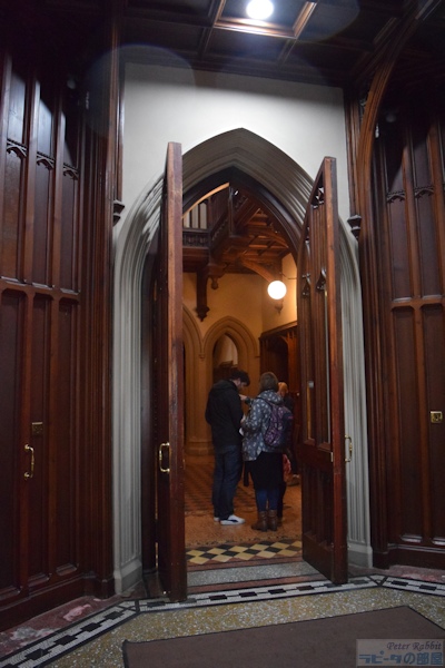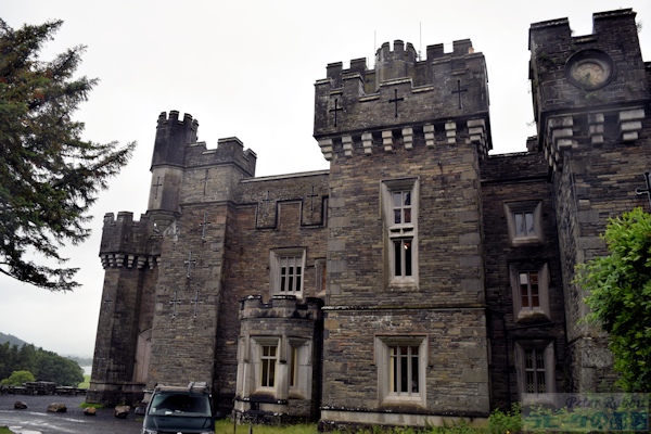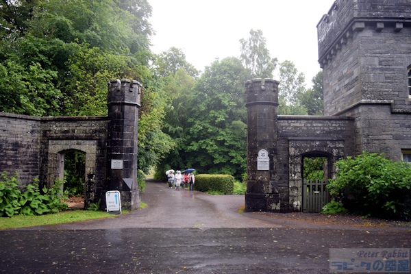 ▼湖水地方で初めて訪れた地、レイ・カースルへ 次の目的地レイ・カースルは、湖水地方で最大の湖、ウィンダミアの北西の湖畔にあります。前日、ヒルトップ農場へ向かう道中で、一瞬だけレイカースルが見えました。 ![]() こちらが一瞬だけ見えたレイカースル。手前がウィンダミア湖で、その先の森に囲まれ要塞のような建物の塔の一部が見えます。この辺りの森は、地名にちなみ「ワットバロウの森(Watbarrow Wood)」と呼ばれています。 レイ・カースル(Wray Castle)は、ビアトリクスが湖水地方に初めて訪れた1882年、16歳の時に滞在した屋敷です。その屋敷は、18世紀後半から19世紀にかけて流行ったゴシック・リバイバル建築(Gothic Revival style)で、1840年リヴァプールの医師ジェイムズ・ドーソンが、妻の父親のジン製造で得た利益で建てました。 妻の父、ロバート・プレストンは、リヴァプールでドライジン(蒸留ジン)を製造し、その蒸留所があった町の通りの名前に、ジンには欠かせないボタニカルであるジュニパー(西洋杜松)にちなんで、「ジュニパー通り」と名付けられるほど繁栄しました。肝心の妻マーガレットは、夫の建てたレイカースルを見るなり二度と足を踏み入れることはなかったそうです。 ビアトリクスは、建物の奇抜さよりも、室内のアンティークな家具に魅せられ、もし自分が家を建てたらこのような家具を並べたいと、書斎や屋敷内の廊下をスケッチし魅せられました。 さて私達は、レイカースルで行うミッションがありました。ビアトリクスがレイカースルの前で撮影した有名な記念写真と同じ位置で撮影を行うこと。私も初めて訪れる場所なので、恐らくこの辺りだろうと予習はしていたものの自信はありません。いざ撮影しようとしましたら、あろうことか車が1台横づけされていて、どうしても写りこんでしまいます。脚立を屋根に積んだ関係者の方かと思い、車を動かしてもらえるよう頼んでみましたが、こっちも困ると相手にしてくれません。みんなで「ちょっとぐらいどかしてくれてもいいのに」とブーブー言いながら(笑)撮影しました。 ![]() 撮影位置は、ビアトリクスの記念写真と見比べると、もう少し後ろにさがって撮影した方が良かったみたいです。 ![]() こちらは正面入口。威圧的で圧倒的な存在感のある建物は、真ん中にある背の高い塔が中心となりその周りに城郭風な屋根が並び、その周りに矢を入れる切れ目の入った小塔が覆っていて、窓は垂直にスライド開閉する落とし格子の窓で、印象的なコントラストを与えています。 ![]() 敷地面積は、830エーカー(東京ドーム71個分)で、ウィンダミア湖に向かって森が広がり、反対側の敷地は牧草地が広がっていました。周囲はフットパスが完備されていて、ウィンダミア湖までの散策も楽しめます。 ![]() この先は入場料が必要 大人9.6ポンド。建物の内部は、長い間子ども為の施設として利用され、一般開放されていませんでした。現在は内部も見学できますが、ビアトリクスが魅せられた調度品など、子どもの室内遊び場(遊具)となっているため撤去されました。装飾を施した柱や、高い位置に張り出した天井の梁、建物の構造物はその当時のまま見られます。 ![]() そしてウィンダミア湖を一望できるこの景色も、建物の上階の方がより全体を見渡せると思います。 ▼運命の出会いをした聖マーガレット教会 ![]() 私達は、もうひとつのミッションのために、小雨降る中をミニバスで通り過ぎた最初のゲートへ向かって、ぞろぞろと歩きだしました。 レイカースルに行ってみて分かったお勧め見学コースは、まずはレイカースルのゲート前で停車し、ゲートの右隣りにある聖マーガレット教会を見学後、再びバスに乗り込みレイカースルへ。このように見学すれば、ゲートからレイカースルまでの約1キロ(片道 徒歩10分から15分)の往復をカットできます。まさか敷地内がこんなに広いとは想像もしていなかった。雨さえ降ってなければ、牧草地を横目に見ながら楽しいお散歩になったかもしれませんが。 聖マーガレット教会は、ビアトリクスが初めて湖水地方に滞在する5年前、1877年にロウレイ(Low Wray)区の教区牧師として、ハードウィック・ロンズリーが赴任しました。ローンズリー牧師は、湖水地方の美しい自然に魅了され、自然景観保護のための活動を行い、やがてナショナルトラストの創設者として、永遠に語り継がれる存在となりました。そんな運命的とも言えるビアトリクスと、ローンズリー牧師が出会った場所こそがレイカースルでした。 河野先生の書籍「ピーターラビットの世界へ ビアトリクス・ポターのすべて」の第7章で紹介されている聖マーガレット教会について、「レイ・カースルに訪れるときは、ぜひとも訪れていただきたいスポットです」とあります。 ![]() 聖マーガレット教会。現在は、建物の保存がされているものの、利用はされておらず、外観を見るだけです。見学者は、私達の他に先に来ていたピーターた