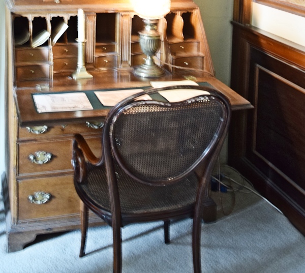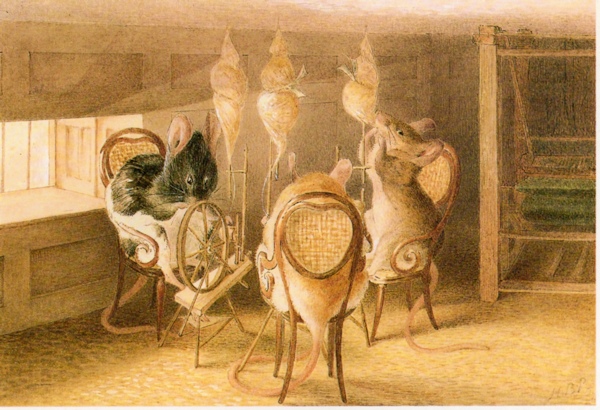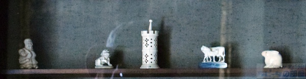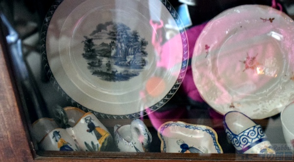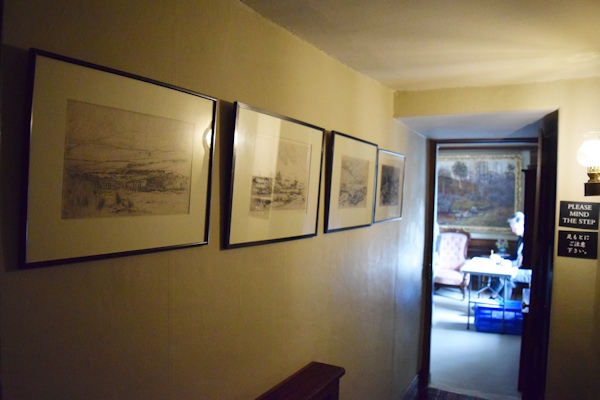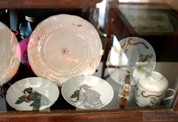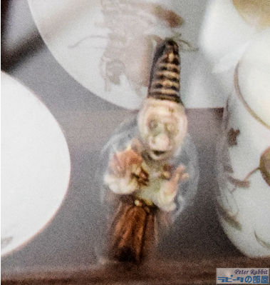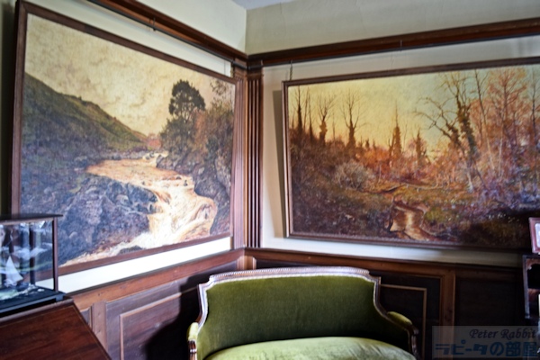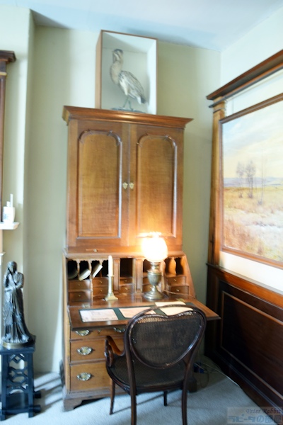 ▼ヒルトップハウスの2階ニュールームへ ![]() 階段を上り、階段に背を向けた右手側、人とすれ違うのも難しい狭くて暗い廊下を進んだ先に、明るく開放的な比較的大きな部屋「ニュールーム」とビアトリクスが呼んだ部屋がある。 この部屋は、1906年にビアトリクスが増築した2階部分で、他の部屋よりも約60pほど天井が高く、壁2面に窓があり、明るく開放感を感じる部屋だ。最初「図書室」と呼んでいた頃は、弟バートラムの大きな作品(油絵100号サイズ)を飾るためだけに使用していた。 ![]() バートラムの作品は、結婚後移り住んだスコットランドの景色を描いたもので、姉のビアトリクスが手のひらサイズの小さな作品が多い中、大きさだけみても対照的だ。こうした作品は、絵描きとしていつかは大作を描いてみたいという願望からか、それとも絵本作家として成功した姉には描けないものをと思ったからなのか、1918年46歳で亡くなった弟を偲ぶかのようにヒルトップハウスのニュールームに運ばれた。 この部屋で真っ先に目が奪われるはこうしたバートラムの特大サイズの作品4点だろう。作品と作品の間に、モダンな飾り柱(ピラスター)が仕切りのように取り付けられている。 ▼挿絵にも描かれたアンティークチェア 図書室として呼んでいた頃はあまり使用されることのなかったこの部屋が、書き物机やビアトリクスの好きなアンティーク家具を配置することで、ヒルトップハウスの中でほぼ毎日のように執筆活動する部屋となった。 ![]() 書き物机の前に配置されているアンティークチェアは、19世紀ドイツの家具職人ミヒャエル・トーネット(Michael Thonet)の作品、ベントウッドチェア(曲木椅子 bentwood chair)で、祖母ジェッシーがカムフィールド・プレイスで使用していたもの。 ![]() このベントウッドチェアは、『ねずみが3びき』という1892年の未発表作品(おはなし全集の改訂版に掲載)に描かれた。 ▼ヒルトップハウスで最も質問が寄せられる展示物 ![]() 書き物机の上にあるのは、サギ科の仲間「ヨシゴイ」の標本。ヒルトップハウス内でゲストに最も質問されるものとして紹介されているスタッフブログによると、この標本もその内のひとつだそうだ。 ![]() 反対側の壁には蝶の標本も展示され、ビアトリクスが熱心に調べたであろう1633年出版の「ジェラードの本草書(Gerad's Herbal)」などもあり、ビアトリクスの博物学への探求心を垣間見ることができる部屋。 ▼ビアトリクスのコレクションに日本の根付が ![]() 壁に吊り下げてあるキャビネットの内のひとつは、チェスの駒、象牙の置物などがあり、 ![]() その中でも特に興味深いのが象牙製の根付が数点あること(棚の上から3段目、左から、福禄寿、獅子、親子牛、琥珀色の目をした兎の4点)。 ビアトリクスと日本といえば、ビアトリクスの1882年(16歳)の作品に、歌川広重の練習「諸職画通三篇」の背表紙が描かれていることが分かり、河野先生がこの発見を2014年にプレスリリースされた。 ![]() もうひとつの食器類が並べられているキャビネット内の隅にあるのも、日本製の浮世絵絵皿と、戦国武将柄の蓋付きコーヒーカップ(1900年製)がある。ビアトリクスのお眼鏡にかなったものの中に、日本のものも含まれているという事実があるだけで嬉しい。 ![]() こちらも小さくて見逃してしまいそうだが、現地では「Monkeyの根付」と紹介されているもの。平戸焼の三番叟(さんばそう)の根付と判明(高さ7.5cm)。写真ではぼんやりしているが、とても可愛らしいものなのでぜひチェックしてもらいたい。ビアトリクスがどういうきっかけで根付を集めたか知りたいと思うのは私だけではないはず。 そういった棚の中にあるものも目を皿のようにして楽しめるということは、マニアックな世界へさらに足を一歩踏み込んでしまったようだ。 ![]() 食器棚にはルビー色のアンティークグラス(一番上の棚)があり、ワインを嗜むこともあったのだろうかと想像が広がる。食器棚の上から2段目の左にあるのは、父ルパートの絵付けによる脚付きカップと、その奥にソーサーがあり、ビアトリクスが6歳の頃の思い出の品だ。 ![]() 食器棚を覗きこまないと見えない下段にあるのは、ちょっと珍しい1690年創業のフランスの陶器メーカーで、アンリオ・カンペールの民族衣装を着たデザインの靴の形をした器や、白鳥の形などをした入れ物やトレイなどがある。 ▼ニュールームには家族の作品が展示されている ![]() この部屋には弟バートラムの作品だけでなく、家族全員の作品が勢ぞろいしている。上から母ヘレンの湖畔の景色を描いたもの、父ルパートの「3匹の盲目ネズミ」、ビアトリクスの「糸車」とある。家族共通の趣味が絵画であり、芸術家一家という側面も改めて垣間見ることができる。 ![]() この部屋の紹介冒頭に戻り、壁2面に窓があるという部分、部屋の入口を背にした右側の窓に注目すると、何やら窓の前で作業をされていたスタッフの方が快く立ち上がって、窓からの景色が見えるよう