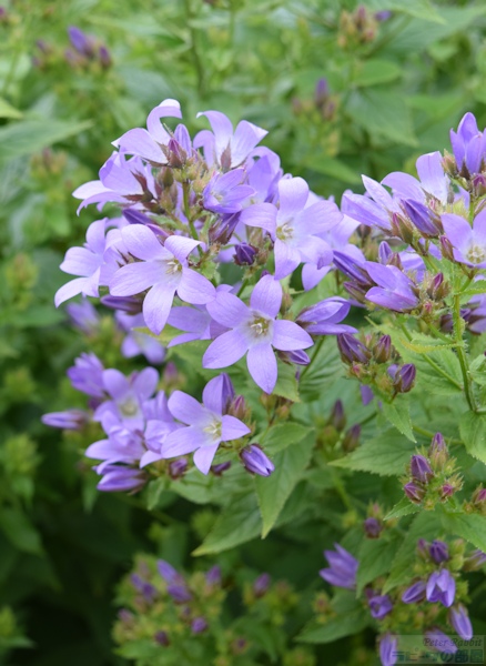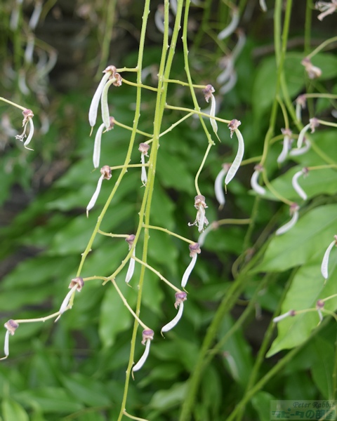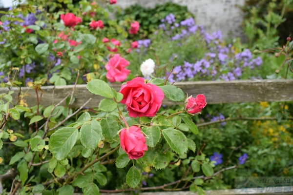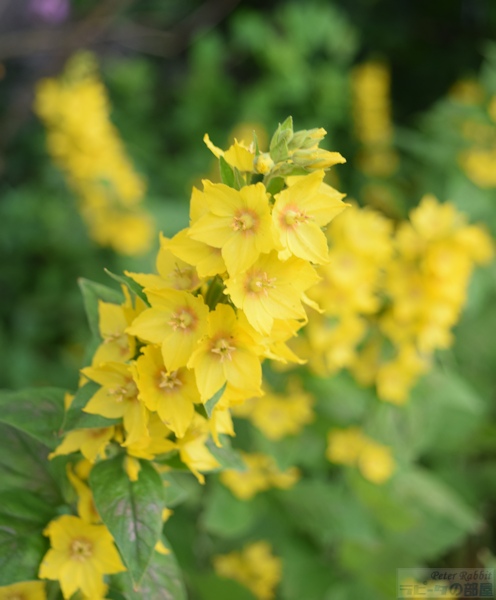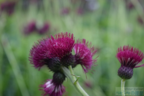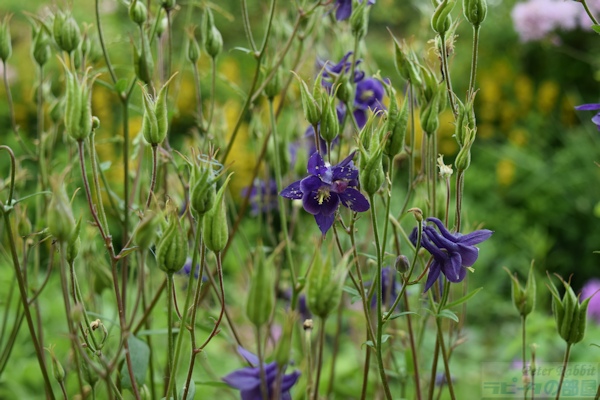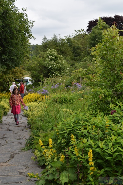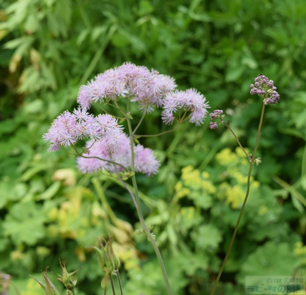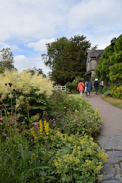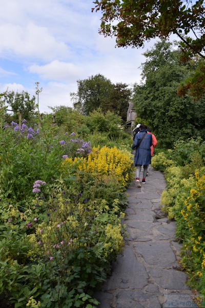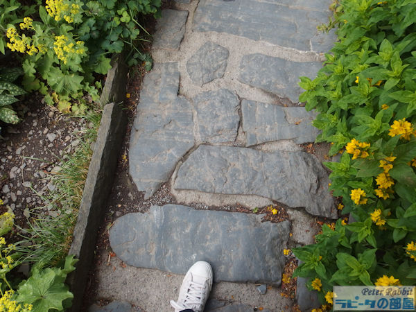 ▼お花畑エリアへ 私が18年前、初めて湖水地方を訪れた際、現地の一日観光ツアーでヒルトップ農場に訪れ、その時はツアースケジュールの関係で、ヒルトップ農場の滞在時間はわずか30分だった。この見学時間内に、すべてを見て回るのは至難の業で、恐らくヒルトップハウスを見学するだけで終わってしまう。ここにはヒルトップハウス以外にも、『こねこのトムのおはなし』や『あひるのジマイマのおはなし』で描かれた美しい庭がある。 そのことは重々分かっていたので、今回私が作成したツアーは、たっぷりと時間がとってあった。それでも見ようによっては早い人、遅い人といる訳でその調整は難しい。私は遅い部類で、2階見学時に窓から庭を見下ろすと、既に数名庭を見学されている方がいた。という訳で、次に紹介するのはヒルトップ農場のガーデンについて。 ヒルトップ農場内には4つのエリアがあり、一つ目は道路に面した入口からヒルトップハウスまでの小道沿いの「お花畑エリア」、二つ目はヒルトップハウス前のアイアンフェンスのゲートから入る「家庭菜園エリア」、三つ目は格子の木製フェンスで区切られた果樹が植えられた「パドックエリア」、四つ目はヒルトップハウスの奥にある「農場エリア」。このうち一つ目と二つ目のエリアが一般公開され、三つ目と四つ目はその景色を眺めることができる。 まずは一つ目エリアの小道沿いの両脇に植えられたお花畑エリアから。 ![]() アンブルサイド近くにある採石場のブラセイ産スレートを敷き詰められた小道は、真っすぐにヒルトップハウスまでつながっていて、『こねこのトムのおはなし』や『こぶたのピグリン・ブランドのおはなし』の挿絵の背景として描かれた。 ここに植えられたお花畑の植物は、一見 雑多に色々な種類が植えられているように見えるかもしれないが、自然に生えているそのままの風景を再現したもので、これらを「コテージ・ガーデン」と呼ぶ。 しかし、この素敵なお花畑もビアトリクスの死去後、再びナショナル・トラストが一般公開するに至るまでにほとんどの植物が絶えてしまい、現在私達が目にしているのは、ナショナル・トラストのガーデナーが、その当時の写真や手紙などの書簡、そして挿絵に描かれた背景を資料として復元されたもの。植えられた品種は、ビアトリクスが生きていた時代のものであり、植物の品種改良の進む現在において100年前の素朴な色を楽しめる。 ![]() ヒルトップハウスを背にして撮影した小道。 ![]() 黄色い花の群生は「オカトラノオ(セイヨウクサレダマ)」 繁殖力の強いオカトラノオは、はびこらないうちに掘り起こし、別の場所に植え替えるという作業をビアトリクスも行っていたそうだ。 ![]() 左側に見える背が高く白い花、茎の先で四方八方に伸びて、黄色みがかった小さな白い花を多数咲かせているのは、 ![]() 「ヤマブキショウマ」 ススキのように風に揺れて存在感ある面白い花でした。 ![]() ヤマブキショウマの足元で、背の低い草花は「オミナエシ?」 背が低いので違うかも。カランコエのような小さな花がたくさんついて初夏に向け色づく花のよう。 ![]() ヤマブキショウマの手前、空に向かって高く伸びているのは「アザミ」。 『のねずみチュウチュウおくさんのおはなし』でジャクソンさんが「ぷっぷっぷう」と飛ばすのはアザミの綿毛。 ![]() エンドウマメは花が終わり、豆の入った鞘が膨らみ始めていました。 ![]() ヒルトップハウスの少し手前、咲き誇る黄色い花は先程紹介した「オカトラオ」、その手前分かりづらいですが、こんな可愛らしい花が、、 ![]() 「ブルガリア・オダマキ」 ![]() 「セイヨウオダマキ」 ![]() オダマキの斜め奥に生えていたのは「カラマツソウ」。ヤマブキショウマ同様、カラマツソウも種や茎がそのまま残ると翌年大繁殖するので、植物が枯れた後の冬の間も手入れが欠かせない。 ![]() カラマツソウの後ろ、オカトラノオの左側で、紫の星型の花をたくさん付けているのは「カンパニュラ・ラクチフローラ(ミルキー・ベルフラワー)」。 ![]() 今度は小径の右側(ヒルトップハウス側に歩いた場合)に目をやると、なんとも不思議な丸い実がたくさんなっている。これは、『ピーターラビットのおはなし』で、ピーターがマグレガーさんの畑でグーズベリー(スグリ)にかけていた網にひっかかった、「グーズベリー」。ビアトリクスもマグレガーさんのように、鳥たちがグーズベリーの蕾をついばむことに困り果てていたようだけど、私達が訪れた時点でまだ網はかけられてはいなかった。 ![]() グーズベリーの先に、花が終わった後に面白い実がなる「ルナリア(別名:ゴウダソウ)」が、枝の先に小判のような実をヒラヒラさせていた。 ![]() ヒルトップハウスはツル系植物の宝庫で、クレマチス、フジ、ツルバラなどが咲き誇る。玄関ポーチ右側の大きなツルが白いフジで、私達が訪問した6月下旬、英国は日本よりも1カ月ぐらい季節の訪れが遅