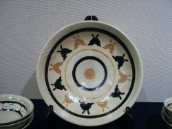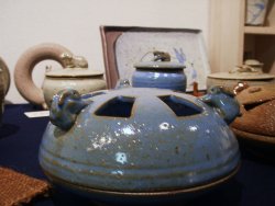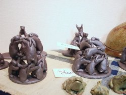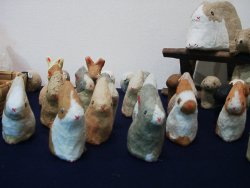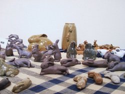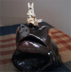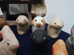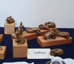 ![]() 「向坂典子展 〜 土に遊び、竹紙に遊ぶ」 6/17(火)〜6/28(土) 場所:GALLERY うぇすと 展示内容:うさぎ物の陶器、日常雑器の展示、東京で初めて発表する竹紙による「うさぎ」「犬」「猫」等の張り子の展示 若狭の赤土を掘るところから作業は始まる。延々と土方作業ならぬ土を掘り、作業場に黙々と運び、それを何度も繰り返す。 やがて土をこね始め、本来の陶芸家としての手腕を発揮する。 興味を持ったもの、依頼を受けたものは、まずはその生き物をスケッチすることから始まり、飼うつもりはなくても愛着がわくと同時に手放せない存在となる。 おたまじゃくしから成長したひきがえるも「かわいくて仕方がない」と、餌の確保に奔走する。 そんな向坂さんの作品の中心となるのは「うさぎ」 大人気のうさぎの置物は、うさぎを飼っている者なら思わず声をあげずにはいられない作品ばかり。 寝ている姿だけでも気持ちよく爆睡している子もいれば、ちょいとたぬき寝入りしている子、足を投げ出し寝ている子、寝ながら毛繕いする子、寝姿ひとつ取ってもうさぎの特徴を見事にとらえ作品化している。 うさぎ飼い主がそれを見た瞬間、その仕草に我が家のうさぎを思い浮かべ、立ち止まり、熱心に見入ってしまう。 向坂さんも、置物を見入るその姿を見るだけで、この方はうさぎ飼い主さんかどうかすぐにわかってしまうと言う。 ![]() 寝ている姿の置物 赤土の置物は、寝て、起きて、ご飯を食べて、また寝る 一連の動きを作品にしたもの。セットで揃えて持ちたいと思う作品 ![]() うさぎピラミッド 一番下にいる子は今にも崩れそうになるのを必死に支えている。 うさぎ独特の丸みのある体の特徴がうまく表現されている うさぎカード立て うさぎが床に寝そべるカード立て ![]() 縦列駐兎の箸置き うさぎが3匹寄り添って並んでいる ![]() 張り子のうさぎ ロップイヤーにも挑戦 犬のように見えてしまうのは、ロップが犬顔に似ているからなのか? ![]() うさぎの後姿が大好きな人にはたまらない「しっぽ大皿」 向坂さんの飼っているうさぎ ヒマヤランのちょびがモデルの焼き物皿 ![]() 取っ手の部分を横からみると、いましたうさぎが。うさぎの耳の部分としっぽの部分がちょうど支えになって、かなり持ちやすいコーヒーカップ。 ![]() ひきがえるの上にうさぎ。 向坂さんの飼っているひきがえるは、やっとあまがえるの大きさにまで成長したが、もっともっと大きくなって欲しいという願望がこの作品にこめられているのかもしれない。 ![]() 「蚊取り線香入れ」 上の円盤部分が蓋となり、蓋を少しずらして中に剣山を入れ、花器として使用してもよい。 ちょっと和風な空間になんともおしゃれ器。 <向坂典子さんの個展を振り返って> うさぎと共に起きて、うさぎの時間を大切に、べったりでもない、だがうさぎが甘えてくる時はとことん接してコミュニケーションする。うさぎが機嫌をそこねると隠れ家から半分顔を出し、人間を気にしつつも近寄らない。 向坂さんにとって、うさぎと暮らすことは、生きるすべてのエネルギーを与えてもらう存在だったかもしれない。 でも決して依存しない、お互い距離を保つ存在でもあったようだ。 作品にこめられたうさぎの仕草も、この距離があったからこそ作品にできたのではないだろうか。 最後に、 向坂さんの愛兎「ちょび」が、お月様に住むちょびのママ福助の元へ帰る。 たくさんのおみやげ話と、個展の大成功の裏で大活躍したちょびへのご褒美を心待ちにしていただろうに。 享年7歳 どうか安らかに。 (向坂典子展報告 ラピータ著)2003.6.28 |