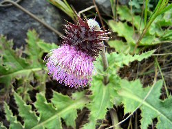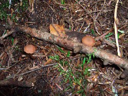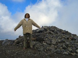 富士山須走り口 5合目より、「小富士」に向かって徒歩10〜15分で到着。 ![]() 小富士 1979m ![]() 両手で富士山のすそ野を表現。この場所からは富士5湖がすべて眺めることができる絶景ポイント しかしながら、雲の中に隠れることも多いので運がよければ見えるかもしれない。 ![]() 小富士までの道のりは、木々に囲まれた森の小道を抜けていく。思いっきり森林浴を楽しめる。 枯れた葉が降り積もり、朽ちかけた木がころがっている場所に行くと。。。 ![]() ![]() 山のきのこがいっぱい生えている。この時期はきのこ採りに大勢の人が小富士にやってくるため、大きくて食べられるきのこは既に採りつくされている。 山のきのこは歯ごたえがあっておいしいけれど、毒きのこもあるので要注意。 小富士に行く手前に山小屋があり、ここできのこ博士がきのこの鑑定をしてくれる(有料) 山小屋には山で採ってきたきのこがたんまりと入った「きのこそば」が食べられる。 ![]() もちろんここにやってくる大勢の人はこの「きのこそば」が目当て。 食べられるまでに1時間以上も待たされてしまったけれど、おいしかった。 「コリコリ、フニュフニュ、ニュル」とこの歯ごたえがたまらん。 ![]() どんな強風が吹こうとも、しっかりと大地に根を下ろして咲く「富士アザミ」 <2005.1.5 きのこそば報告> |