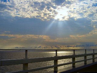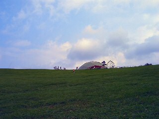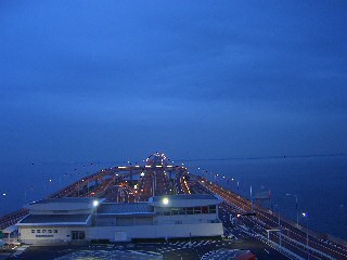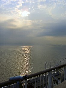 前々から行きたいと思っていた「海ほたる」に、とうとう行くことができました。横浜方面から、首都高速湾岸線を経由し、ベイブリッジ、つばさ橋と次々に通過、東京電力の火力発電所のタンクを横目にしばらく行くと、やがて東京湾トンネルの中に吸い込まれて行きます。トンネル出口手前より、東京湾アクアラインへの分岐の案内表示が見えると、いよいよ「海ほたる」へ。 ![]() 東京湾アクアラインの海底トンネル内。右下に出ているナビ表示を見ると、海の下を走っていることを示す水色の画面が写し出されています。ぽっかり穴が開いているのは、風の塔の場所を示しています。 ![]() お盆時期にもかかわらず早朝ということもあり、渋滞せずに「海ほたる」に到着。川崎方面から「海ほたる」に進入すると、普通車は3Fの駐車場へ。 ![]() 海ほたるより川崎方面側は、海しか見えず。遠くに見える明かりは川崎の夜景。千葉方面側は、海底ではなく海の上を渡るため、高速道路が一直線につながっていて、夜の海にそびえたっていました。 海ほたるパーキングエリアの、海ほたるという名前は、一般公募から選ばれた名前だそうです。遠くから見ると、海の上にほたるが点灯して見える、そんな姿をこの名称から想像していましたが、実際は「東京湾に浮かびあがる海上施設の美しさをイメージしている」としてつけられた名前だそうです。 海ほたるに到着したのが、朝の4時半。何故そんなに早起きして行ったのかというのは、海ほたるからの日の出が見たかったからです。しかし、雨の確率40%の天気予報では日の出を期待できる訳がなく、予報では日の出時刻4時54分となっていましたが、この時間になっても太陽は雲の中から姿を見せてくれませんでした。 ![]() 日の出時刻4時54分千葉方面を望むも、この有様。 海ほたる内無料休憩所に展示してあった日の出を撮影した写真パネル 写真パネルで見る日の出は、当たり一面真っ赤に染まり、幻想的な世界が繰り広げられていました。このような日の出を見るためには、冬でなければいけないのかなー。 ![]() 木更津名物といえば、あさりだそうです。これは名物の「あさりまん」 レストランの店内はもちろん、海ほたる全体が大型客船のようなつくりになっています。海の上に漂う船に乗船している気分を、高速道路のパーキングエリアで楽しむことができるのです。 ![]() 6時半頃、ようやく雲に切れ間ができ、太陽が顔をのぞかせました。水面に太陽の光がキラキラと反射し、とても綺麗な朝日を見ることができました。 海ほたるを後にして、千葉方面に向かい鹿野山にあるマザー牧場へと行きました。マザー牧場へ到着する頃には、気温もぐんぐんと上昇し、8時前なのに既に30度越え。人間は既にばてばてです。8時半の開園と同時に、先着200名限定のブルーベリー摘みをしにブルーベリー園へと向かいました。 ブルーベリー園: 関東最大の2200株のブルーベリーを保有。毎日、先着200名限定のブルーベリー摘みができる。 300グラムまで800円(8/31まで)摘み取ったばかりのブルーベリーでジャムつくりにも挑戦できる(200円・ビン代込み) ブルーベリーは、ツヅジ科スノキ属低木果樹。主産地は、アメリカ東海岸一帯。 農園では、ハイブッシュ種(ウエイマウス ブルーレイ等、収穫6−7月)と、ラビットアイ種(テイフブルー ホームベル ウッダード、収穫7-8月)を栽培。4月初め釣鐘状の小さな花が咲き、濃紫色の実は甘酸っぱく、夏の収穫を待ちます。秋には紅葉し、それは見事です。(マザー牧場ブルーベリー園の説明ボードより) ![]() ブルーベリー摘みの農園入り口。ここで入場料を支払い、300グラム入る小さな箱を受け取る。 ブルーベリーの説明にもあったとおり、紫色に熟した実のみを収穫していく。入り口に近い樹木には、まだ熟していない赤い実が多いですが、蜘蛛にめげずに奥の樹木に進むと、甘くておいしい実をたっぷりつけた樹木に出会えます。 ![]() ブルーベリージャムつくりにも挑戦。茎やゴミなどを取り除いたら鍋にかけひたすらかき混ぜると、ぶくぶく状態になっていき、砂糖100グラム一気に加え、どろどろになってきたら出来上がり。ビンに詰めたら、ジャムが熱い内にビンをひっくり返して蓋の部分を殺菌。これで蓋を開けずに3週間、蓋を開けたら1週間の賞味期間とのこと。添加物一切なしのジャムって、体にもいいし、おいしいし、素敵!ジャム作りにはまっちゃいそう。 ![]() 次に、牧草地の山の上に建つアグロドームにて開催されているショー「牧羊犬とまきばの仲間たち」を見学しました。 アルプスの少女ハイジのテーマソングが会場内に流れたと思ったら、ステージ左手からヤギのユキちゃんファミリーがやってきて、ステージ中央にばら撒かれていたペレットをほおばり、たちまちステージ奥に戻る。そして司会のお姉さんが登場。一瞬の出来事だったにもかかわらず、ヤギのかわいさに、ステージに目が釘付けになってしまいました。 司会の