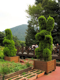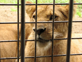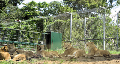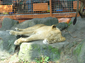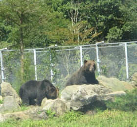 富士サファリパークの入場招待券をいただくことができたので、暑さも少しやわらいだ日を選び行ってきました。 園内は、それぞれのゾーンに分かれていて、それぞれのゾーンの手前では自動で開閉するフェンスで仕切られていました。園内のサファリゾーンは、大迫力の園内バスで回るのが一番楽しめると思ったのですが、さすがに人気のある園内バスは、3時間待ちの大行列。そこで、マイカーでとりあえず見てまわることにしました。 まずは、「BEAR ZONE」 ヒグマの中でも最も大きくなるコディアックグマや、ビアトリクス・ポターが『カルアシ・チミーのおはなし』で登場させたアメリカクロクマも。クマは4つ足で歩いていればそんなに怖いと感じませんが、2本足で立ち上がると、やはり恐怖を感じずにいられません。 ![]() その頃、園内バスではこんな光景が。軽やかな音楽が流れたと思ったら、アメリカクロクマでしょうか、バスに近づき餌のおねだりをしています。目の前でクマが見られるのは園内バスならでは。 ![]() つづいて「LION ZONE」 富士サファリパークのコマーシャルソング、「ほんとに、ほんとに、ほんとに、ほんとにライオンだぁ。近すぎちゃってどうしよう、富士サファリパーク」とあるように、近すぎちゃってどうしよう状態です。目の前にライオン、信じられない光景にもしかしてこのライオンの中に人間が入ってサービスしてるのじゃないかと思うほど。でも、よく見るとこのライオン、舌なめずりしています。そのわけは。。。 ![]() そう、またまた園内バスです。このライオンは、園内バスの乗客よりもらえる餌が欲しくて近づいてきたのでした。でも後ろにバスがいるというのに、ぐっすり寝込んでいるメスライオン。お腹がいっぱいのよう〜 ![]() どうですこのメスライオンたちの優雅なこと。こんなにゆったりとした姿を見ていると、思わず近づいて撮影したくなる気持ちすごくわかります。でもそこは猛獣たち。人間は簡単に食べられてしまうので、マイカーはゆっくりと停まらずに前進しなければなりません。 ![]() みんな木の下にわずかに広がる木陰を確保し、お昼寝三昧。 ![]() 木の根元は、猫の爪とぎならぬ、ライオンの爪とぎになっているのでしょうか。それにしても完全に宙に浮いてます。木の上にもお昼寝しているライオンがいました。舗装されていない道は、サファリトラック専用道です。 ![]() 次は「TIGER ZONE」いよいよ、待ちに待ったタイガースゾーン。じゃなかった。 シベリアトラという種類だそうですが、トラはその数が激減し、絶滅危惧種になっているそうです。知らなかった。 確かにこのエリアでもトラの数は少なかったかも。みんな足を投げ出し木陰でお昼寝中。 ![]() 次は、「CHEETAH ZONE」チーターゾーン。足が長くていかにも走るのがはやそうなチーター。いました、ピンクの花が咲き乱れるさるすべりの木の向こうに。「なにも見えないぞ???」そういうツッコミが入ると思って。。 ![]() 「ほらね、いたでしょ」チーターはやっぱり美しい。目頭から口にかけてのマークを、ティアーズマークと言うそうです。陸上を走る動物のなかでは一番足がはやく、瞬間スピードは時速100キロ以上になるとか。 つづいて「ELEPHANT ZONE」。アフリカゾウがいました。 ![]() 耳をバサバサと翼のように広げてはとじ、迫力満点!同じゾーンにボンゴがいました。 ![]() つづいては、「HERBIVOROUS ANIMAL ZONE」草食動物ゾーン。木の幹には、動物にかじられないよう、網状のフェンスが巻き付けられています。 ![]() きりんが車列の中を堂々とよこぎっていきます。無事に道路反対側に渡れて一安心です。 ![]() しっぽが別の生き物のような動きで愛らしい、草食動物たち。みんなで仲良く牧草をついばみます。 ![]() 高いところにのぼるのが大好きなやぎ。やぎのために木の枝から牧草がぶらさがってます。怪我をしないようになのか、邪魔な枝と葉はすべて取り払われていますが、まるでやぎ専用ジャングルジムのようです。 ![]() 最後に「MOUNTAINOUS HERBIVOROUS ANIMAL ZONE」山岳草食ゾーン。こちらの木の幹は、木の皮をはがされないよう、幹に木片をぐるりと巻きつけガードされています。 ![]() ニホンジカに、からだが真っ白のワビチ ![]() 前髪がもしゃもしゃのヤク、そしてロバ。ポニーも可愛いけれど、ロバも可愛い。 ![]() 山岳草食ゾーンの林の中を抜けると、車でまわれるサファリゾーンは終了となり、第2駐車場へ。そこはまた別世界、左手に雲に隠れているのは富士山で、一面に広がっているのは牧草畑、その先に忠ちゃん牧場があります。 ![]() 「さて、どこに何が見えるでしょう?」 正解は、ワオキツネザル。よーく見ると、ほら木の枝に1匹。 ![]() 「フワフワガーデン」には、うさぎとモルモットのふれあい広場。うさぎは、立ち耳と、垂れ耳が交代でふれあい広場に登場します。どのうさぎもみんな太っていて、ストレス太りなのかしらとも思ったり。 ![]() ゴールドクレストで作られた