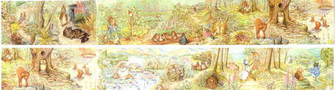 ビアトリクス・ポターの作品の主要なシーンが見事に横一列につながったデザイン。