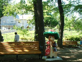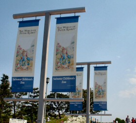 【埼玉県こども動物自然公園にピーターラビットがお出迎え!】 2007/5/5 ![]() 大東文化大学 ビアトリクス・ポター資料館のある、埼玉県こども動物自然公園では、2007年5月より、入場口から園内に足を踏み入れると、写真左のようなピーターラビットのノボリがお目見えしました。 また園内を走る汽車型バス「彩ポッポ」の1台が、ピーターラビット号(写真右)に模様替えしました。彩ポッポバスは、ビアトリクス・ポター資料館の前を通過し、坂をのぼってコアラのいるピクニック広場まで連れて行ってくれます。 今年で27年目を迎えたこども動物自然公園では、5月5日のこどもの日にあわせて、子供の入園料と、こどもの城の入館料を無料となり、多くの方々が遊びにいらしたそうです。入園時には、ピーターラビットと、ベンジャミン・バニーが手を振って迎え入れ、一緒に握手をしたり、ポーズをとったり、記念撮影に応じてくれたりと。その様子は、関連サイトの新聞報道でご覧ください。ビアトリクス・ポター資料館では、5月5日、6日の両日に絵本の読み聞かせが開催されたそうです。 園内にあるビアトリクス・ポター・ショップの隣には、装いもあらたにピーターラビットと、ベンジャミン・バニーのモニュメント付きベンチが設置され、ここで記念撮影をとると、写真の背景にビアトリクス・ポター資料館が見事におさまるそうです。 ![]() ![]() この模様は、チラシでご確認ください。 こども動物自然公園2007年に配布されたチラシ |