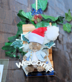 クリスマスカラーに染まった店内の様子 ![]() こちらに来ると楽しみなのがビアトリクス・ポター・ショップ。毎回素敵なラッピングと飾り付けで楽しませてくれます。 ショップ入口横に、サンタ帽をかぷったピーターがお出迎え。入口正面に飾られたクリスマスツリー。このツリーは、赤、ピンク、白のポインセチアで華やかさを演出していました。 |