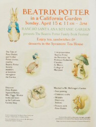 ・「Miss Potter's guide to the Lake District」 2007年1月6日付け THE DAILY TELEGRAPH 最新情報の一環として。 ![]() ディリーテレグラフ紙のニュース http://www.telegraph.co.uk/news/main.jhtml?xml=/news/2007/01/06/npotter06.xml こちらに記事の内容が掲載されていました。 ディリーテレグラフ紙の「ミス・ポター」特設サイトは、こちら http://telegraph.dreamhosters.com/sites/beatrix/ ・ビアトリクス・ポター協会のイベント ビアトリクス・ポター協会のアメリカで開催されたイベントチラシ。 ![]() 「BEATRIX POTTER」 in a California Garden 4月15日(日曜日)午後1時〜3時 場所:アメリカ カリフォルニア州 クレアモント市 クレアモント大学に隣接した、 ランチョ・サンタアナ植物園(RANCHO SANTA ANA BOTANIC GARDEN) イベント内容: ・ビアトリクス・ポター協会のメンバーによる、リーディング ・「BEATRIX POTTER the Naturalist」と題した講演を開催 セント・マリー大学 Katherine Chandler教授による ・カリフォルニア・ガーデン・ショップ ・マクレガーさんの庭で開催されるゲーム大会(間違い探し、つくっちゃおう、他) 植物園のシンボルツリー、かえでの木の下で、特設ティーハウスがオープン。 関連サイト: <海外> HOUSE OF THE TAILOR OF GLOUCESTER http://www.tailor-of-gloucester.org.uk/ THE BEATRIX POTTER SOCIATY http://www.beatrixpottersociety.org.uk/ Armitt Library & Museum Centre http://www.armitt.com/ LINDA LEAR「BEATRIX POTTER A Life in Nature」 http://www.bpotter.com/ <国内> 埼玉県立こども動物自然公園 http://www.parks.or.jp/sczoo/ 大東文化大学 ビアトリクス・ポター資料 http://www.daito.ac.jp/potter/ |