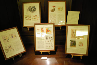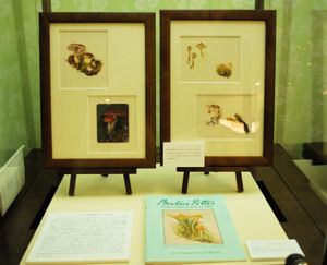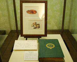 ![]() 11月17日より、ビアトリクス・ポター資料館にて、開催されたクリスマス企画展「キノコ研究者としてのビアトリクス・ポターとイギリスのクリスマス」。訪れたこの日は、森の教室で植木ゆり&かなで隊の音楽演奏会が開催されるという日でした。 ![]() 資料館の入口を入ったすぐに飾られたクリスマスツリー。バラとシルバーのリボンをあしらった飾りつけがとても華やかでした。 「ビアトリクス・ポターとキノコの研究について」と題された展示は、右上の写真の左の展示より順に紹介します。 ![]() 写真左: 1884年、ビアトリクス・ポターの祖母ジェシー・ポターよりプレゼントされた「British Wild Flowers」の書籍(写真右側緑色の表紙)。この書籍は、英国の野花が描かれた図鑑で、見開きに祖母直筆のサインがあり、その写しが拡大され写真左中央に。奥のレプリカ作品は、上 「?」 、下 「カラカサタケモドキ」1893年9月ダンケルドにて。 写真右: 湖水地方アンブルサイドにあるアーミット・ライブラリーは、ビアトリクス・ポターが描いたキノコの作品のそのほとんどが収蔵されています。「A Victorian Naturalist」の書籍(写真右側)は、これらアーミット・ライブラリーの作品についてや、ポターとの関係などが紹介されていました。 また、ビアトリクス・ポターが、キノコの研究に没頭したきっかけとして、スコットランドのダンケルドにあるダルガイズ荘で過ごしていた頃、郵便配達人チャールズ・マッキントッシュと知り合ったこと、彼がアマチュアの博物学者としてキノコの知識が豊富だったことなどのエピソードを紹介(写真左下)。奥のレプリカ作品は、上 「?」、下 「ハイイロシメジ」1893年11月。 ![]() ビアトリクス・ポターは、キノコへの興味から、やがてチャールズ・マッキントッシュという共通の話題を高めあうことのできる出会いを経て、さらには科学者である叔父のヘンリー・ロスコーが支援してくれることにより、キノコ研究者への道を突き進み、「ハタラケの胞子の発芽について」という論文を作成するに至ります。が、女性であるがゆえに挫折を受けることになるのです。 「Beatrix Potter The Unknown Years(写真右下)」Elizabeth Battrick(著)は、ビアトリクス・ポターがキノコの研究者となり、挫折するまでの知られざる日々のエピソードを紹介した冊子です。奥のレプリカ作品は、左上 「シロエノクギタケ」1894年8月18日、左下 「ベニテングダケ」 1890年頃、 右上 「カラカサタケ(左) シワカラカサタケ(右 1893年10月)」 右下 「ガンタケ(左 1893年8月) エノキタケ(右 1892年)」 ![]() 左下から、「幼少期のスケッチ」は、1875年8歳の時に描いた作品。「ポターがスケッチを始めた背景」と題された解説には、父親ルパートの影響と、その時代の家庭環境の中で、ごく限られた人たちの接触しか許されず、動植物への感心が自然と高まっていくという内容。 中央下にあるのは「昆虫のスケッチ」。作品は、様々な昆虫のスケッチと、チョウの羽を顕微鏡で観察しスケッチしたもの。「ポターの優れた観察力」と題された解説には、その細部にまでこだわる観察力と、卓越した描写力について触れ、『のねずみチュウチュウおくさんのおはなし』に登場するたくさんの昆虫について、さらに作品の裏話として、作品に登場するはずだったワラジムシ、ハサミムシ、ムカデが、ゴミムシとチョウに差し換えられたこと。さらに、チョウがなめている角砂糖は、19世紀末期に生産されるようになったもので、ヴィクトリア時代の生活の一部を映すものという内容。 右下にあるのは「人々のスケッチ」。人々の姿を描いたスケッチと、「ブドウを運ぶ給仕」、『ティギーおばさんのおはなし』に登場するルーシー。「人が描かれているポターのおはなし」と題された解説には、『ピーターラビットのおはなし』に登場するマグレガーさんと、『ティギーおばさんのおはなし』のルーシー。マグレガーさんも、ルーシーも、実際にモデルとなった人物がいたということや、人を描くのは苦労したことなどがポターが編集者のノーマンに宛てた手紙に書き記されていたという内容。 左上にあるのは「動物のスケッチ」。羊の頭、ツグミの死骸、雌鳥の頭のスケッチ。「好奇心あふれるまなざし」と題された解説には、幼少の頃のポターの楽しみは部屋で動物を飼うこととし、ただ飼うだけにとどまらず、その生き物が亡くなると、骨格をスケッチし骨にラベルをつけて保存したことなど。博物学的な知識と、動物への愛着が作品にも生かされているという内容。 右上にあるのは「植物のスケッチ」。キンチャヤマイグチ(キノコ左上)、『りすのナトキンのおはなし』の挿絵に登場するキノコ、タイガー・リリーのスケッチ。「絵本の挿絵に役立ったキノコのスケッチ」と題された解説には、キノコを描く際のアドバイスを、キノコに詳しいチャールズ・マッキントッシュより受け、瞬く間に描く技術が向上した点。また『りすのナトキンのおはな