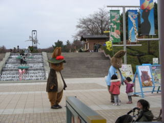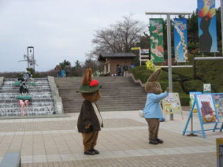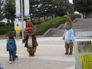 埼玉県こども動物自然公園で「Happy Easter Peter Rabbit 2011」のイベントが開催されました。イベント期間中の土曜日・日曜日・祝日は、エッグハントが行われ、園内のどこかにイースターエッグが隠され、それを見つけるとご褒美がもらえるというもの。 9時半の開園に少し遅れて入場すると、ピーターとベンジャミンがゲストを出迎えてくれました。 ![]() 男の子が「ベンジャミン」と駆け寄ります。 あと一歩というとこで「やっぱりこわい〜」と引き返します。 ![]() ピーターが子供達に手を振ります。 「ピーター」と女の子たちが駆け寄ります。 それを見たベンジャミン、ちょっぴり寂しそうです。全国のベンジャミンファンの子供たち、ベンジャミンを慰めてあげてくださいね。 入場ゲートのお知らせボードにエッグハントの遊び方とヒントがあります。隠されているイースターエッグの数は全部で20個。 ヒントは10個なので、ヒントの場所一か所につき1〜3個あるということに。 ![]() 開門と同時に一目散に走って入った子供たちは、ピーターラビットの森で既に見つけた様子。 まだオープンしたばかりというのに、コアラのいる東園側に向かう彩ポッポは満員で、その場所には確実に4個のエッグが隠されている。 東園に徒歩で向かっても間に合わないと判断し、西側の高台にいるサイチョウ(写真)コーナーに向かいました。 ![]() この日は、気温10度以下という4月なのにとても寒い一日でしたが、エッグ探しに夢中になっている間は寒さを感じません。そうこうする内に、とうとう植え込みの雑草の茂みに頭だけ出した状態で「あった〜!!」と見つけました。 イースターエッグは発砲スチールでエッグ型に切り取られ、彩色されたもの。透明のケースの中に入れられていました。周囲には誰も見当たらず、おかげで見つけることができました。サイチョウさん、ありがとう〜。 ![]() イースターエッグも見つけることができ、ようやくコアラのいる東園に到着。お母さんに抱っこされる赤ちゃんコアラ。 耳を折りたたみ、首を丸めて寝るコアラ。寝姿はクマのようにも見えたりして。 ![]() ワラビーも赤ちゃんがお腹の袋の中にいました。 カンガルーの親子? 袋の中から顔をちょこっとのぞかせる姿の可愛いこと。 ![]() 「エッグ見つけた!?」と思ったら、タマゴの展示コーナーでした。 東園は、アスレチック広場とピクニック広場がありましたが、どちらも子供たちの大人気エリアでイースターエッグは見つかりそうもありません。 ![]() イースターエッグは、案内所でご褒美に交換します。「どちらがよろしいですか?」と差し出されたご褒美は、埼玉県こども動物自然公園オリジナルのピーターラビットクリアファイルと、かすみ草の種が入ったピーターラビット種カードでした。そこでクリアファイルをいただくことに。 イースター・エッグハントのイベントを満喫して、午後は園内にある大東文化大学ビアトリクス・ポター資料館の開館5周年記念特別講演と特別企画に参加しました。 (2011.4.4 レポート 作成: ラピータ ラピータの部屋コンテンツ) 関連サイト:埼玉県こども動物自然公園: http://www.aya.or.jp/~sczoo/ |