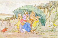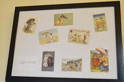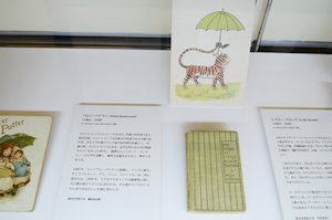 | 「傘をもった動物たち」 なんてチャーミングなタイトルなんでしょう。 普段何気なく読む動物が登場する物語。「傘」というアイテムに注目して物語を探す旅に出る。そう考えただけでワクワクしませんか?何故そこに注目されたのかも伺いたいと資料館に行ってきました。 ![]() 12月のビアトリクス・ポター資料館。ガーデンは冬直前の冬眠の季節。名残を惜しむかのようにバラが一輪、その美しさを誇っています。ローズヒップは、鳥たちの冬の大切な食糧。まだ他についばむものがあるのか、たくさんの実をたくわえていました。 *資料館内は撮影禁止ですが、特別な許可をいただき撮影させていただきました。以下、館内の写真になりますが、一部資料画像もあります。ご了承ください。 特別企画展は、2Fの研修室にて開催されていて、資料館にて常設展示されている「A Happy Pair(幸福な二人づれ)」(1893)が描かれたボードを中心に、ビアトリクス・ポターが大きな影響を受けたとされるクリフトン・ビンガム(Clifton Bingham)の「Pitter Patter(ピター・パター)」(1891年)の表紙を紹介。 ![]() どちらも表紙に同じ色の大きな傘が描かれていて、傘のデザインも同じ。 この類似するふたつの挿絵の関係については、いずれ研究により明らかにされるとも記してありました。 また、クリフトン・ビンガムと共に、ビアトリクス・ポターが影響を受けた人物として、ヘレン・バナマン(Helen Bannerman)の作品「The Story of Little Black Sambo(ちびくろさんぼのおはなし)」(1899)もありました。影響を受けた考えられている部分として、手のひらサイズの本の大きさ、The Story of〜で始まるタイトル、物語の書き出しOnce upon time there〜など。 ![]() 主人公さんぼは、上等な服と傘を持ち散歩に出かけます。途中トラに襲われ、自分の身に着けていたものをひとつずつトラに渡していく物語。最後に残った傘をどうやってトラに持たせるのかといったところでは、しっぽに結わえるという機転を利かせる場面。恐ろしいトラも、傘を持った途端チャーミングになり、笑みがこぼれるから不思議ですね。 今度はビアトリクス・ポターに影響を受けた挿絵が画ハリー・ラウントリー、児童文学者モーリス・センダックの傘を持つ動物たちも紹介されていました。 ![]() モーリス・センダック(Maurice Sendak)「Pleasant Fieldmouse」に登場する傘をさしたマウス。 ハリー・ラウントリー(Harry Rountree)「Bunny Boy and his Magic Umbrella) ![]() クニヒト&ケネディ、マーガレット・テンペスト、ルイス・ウェインのポストカード この中で、マーガレット・テンペストのポストカードが、特別企画展のチラシにも掲載されていましたが、説明にもテンペストは、ビアトリス・ポターより多大な影響を受けているとありました。 ![]() 私も偶然ながらいただいたポストカードの中に、マーガレット・テンペストが3作品あったので紹介します。 「ビアトリクス・ポターの作風に似ているから」といただいたのですが、やはり影響を受けられていたのですね。 ![]() ビアトリクス・ポターの作品の中から、傘をもった動物たちへと目を移すと、『ピーターラビットのおはなし』の傘をもってでかけるおかあさん、『パイがふたつあったおはなし』の花束と傘を手にもつダッチェス、『ひげのサムエルのおはなし』のリビーは、こねこのトムのお母さんタビタにイーストを借りにやってきます。こうして見ると、出かける際は、雨が降っていなくてもおしゃれなアイテムとして傘をもつのは英国人のマナーのひとつなんですね。それが物語にも描かれているのかもしれません。 そして、リビーはひげのサムエルを追い払うための武器として、傘を手に持ったまま物語は進みます。とっさの身を守るアイテムとして頑丈な作りなのかもしれません。 『カルアシ・チミーのおはなし』で描かれている傘については、 「カルアシ・チミートとカアチャンの夫婦ふたりの信頼や愛情を表す重要なモチーフになっている」と解説にありました。 ![]() 『まちねずみジョニーのおはなし』の田舎に暮らすチミー・ウィリーは、植物の葉が傘代わり。田舎の豊かな自然を見事に表現しています。『セシリ・パセリのわらべうた』、『ずるいねこのおはなし』にも傘をもった動物たちが登場します。 その他にもビアトリクス・ポターが幼少期に描いたスケッチや、叔母のロスコー夫人に贈った「クリスマス・パーティ」の水彩画作品にスケッチ、ポター自身が撮影された写真からも傘をテーマに紹介されていました。 ビアトリクス・ポター以外にも、表紙に傘が描かれている児童文学書の紹介がありましたので、タイトルだけでも紹介しておきます。 ジャック・プレラツキー&キャリー・バーガー「大きな傘を差したゾウさんを見てごらん」(2006) ディーター・シューベルト「アンブレラ」(2011) ジョン・ミュース「パンダのシズカくん」(2005) 戸田和代&よしおかひろこ「かえるのかさやさん」(2003) ガース・ウィリアムズ「青い傘の下で」(19