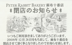 ●Peter Rabbit Bakery 麻布十番店 2008年12月28日(2007年9月オープン)をもって閉店