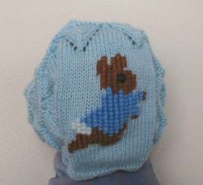 ピーターの編みこみでベビー用帽子を作ってと言われ、ピーターの編みこみ用本を見ながら製図を作成し、こんな作品が出来あがりました。 帽子本体は、原型のベビー用帽子を見本に側面と正面には模様を入れ、帽子の後ろ部分をアレンジしてそこにピーターを入れてみました。 ピーターのニットの本を見るとピーター部分は編みこみになっているのですが、一部分だけの編みこみは糸替え部分がどうしてもきれいな仕上がりにならないので、クロスステッチの要領でピーターラビットに仕上げてみました。 使用した毛糸 薄い水色の糸を1個ちょっと ピーター部分: ジャケット 青色、体 茶色、しっぽ 白、目には濃い茶色のボタンを使用。 ピーターの体にあった茶色の糸がなかなか見つからず、売り場にあったクロスステッチの刺繍糸を参考にしながらアクリルが50%混ざった茶色の糸が一番いいように思いこれにしてみました。 出来あがってみるとアクリルが混ざった糸なので、少し毛羽立った感じがうさぎらしくていいかなと思います。 |