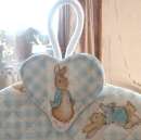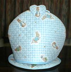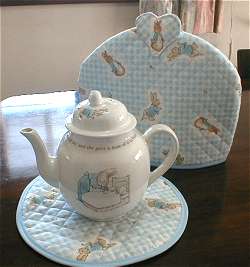 (持ち手の部分にはピーターのハートのアクセント) ピーターのキルティング生地を使って、ティーコゼー&ティーマット作成しました。 ティーコゼーと一緒にティーマットもあるとポットのお湯も冷めにくいと聞き、 おそろいのマットも作ってみました。
