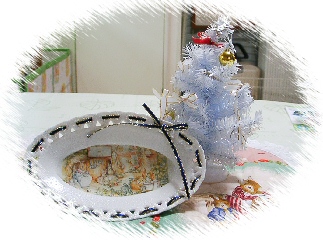 | この作品は、デコパージュの技法で作成したものです。 大好きな絵柄をモチーフに、手のひらサイズのお皿のくぼみにはまるように絵柄の大きさを調整しました。 そして、お皿の周りの飾り穴にはクリスマスを演出するように、ラメの入ったリボンでコーティング。 お皿にもラメのように光沢がでるようコーティング剤に工夫をこらしました。 ミニツリーと一緒に飾ったら、クリスマスを華やかに演出する装飾品のようになりました。 ![]() |