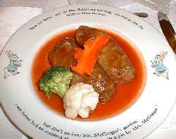 ・東京パレスホテル 地下1階 カフェ・レストラン「ハミング」にて ![]() 「ピーターラビット ベジタブル料理」を食べます。 店内は、ピーターの絵がいっぱい飾られていて、 お水のコップもピーターなんです。 お茶会当日は、ロールキャベツにしました。 上にのっていたのは、ピーターのにんじんです。 ピーターの型は、特注で作られたものだそうです。 食事も終え、一息ついて、さあ飲み物でもという時に (*O*)ピーターラビットの着ぐるみがやってきてくれました。 ![]() ・ピーターラビットベジタブル料理 カフェ・レストラン「ハミング」(地下1階) ・ピーターラビットサマーご宿泊プラン ピーターラビットグッズいっぱいのお部屋に泊まれます。 プレゼントもあります。 (ぬいぐるみ、スリッパ、フェイスタオル、その他) 2人で泊まると、プレゼントの内容が少しずつ違うようです。