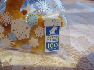 (写真左) 花雪さんお手製クッキーの包みには、それぞれピーターラビット100周年の記念ロゴがあり、それをめくるとプレゼント当選番号が分かるというもの(写真右)