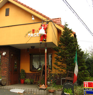 イタリアンレストラン「パーチェ」 クリスマスディスプレイで、煙突ではなく、屋根からはしごで降りてきたサンタクロースが(写真右)