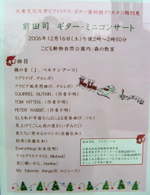 クリスマスイベントのミニコンサートとして企画されたギター演奏を聞きました。ギターの奏でる旋律を大切にされた演奏で、心に染み渡る音色でした。途中、こねこのトム、りすのナトキン、ピーターラビットと3曲続けて演奏してくださったのですが、切れ目がわからなくて、どこからがピーターラビットの曲だかわからなかったのが残念でしたが(^^;)