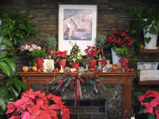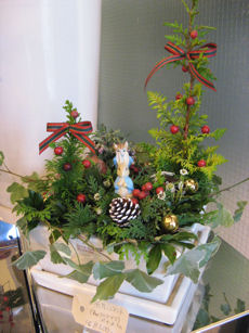 ちょうどクリスマスシーズンだったため、店内のディスプレイはポインセチアや南天の赤が、モミの木など緑の植物に映え、クリスマスカラーになっていました(写真左) クリスマスアレンジ(写真右)