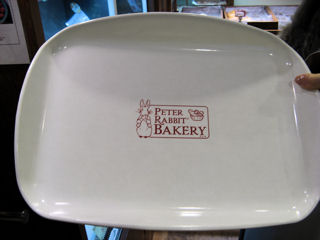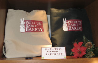 パンを選ぶ際のトレイもピーター模様(写真左)。オリジナルのエコバックも販売されていました(写真右)