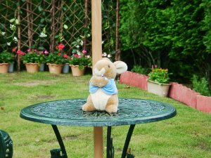 ホテルの内庭で、ピーターラビットの装飾を織りまぜた休憩スペースをご用意。