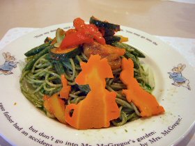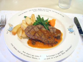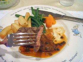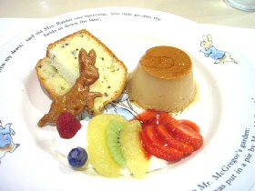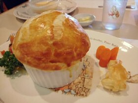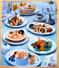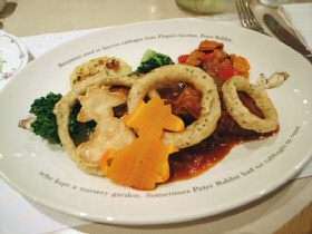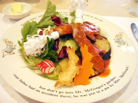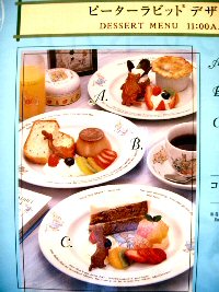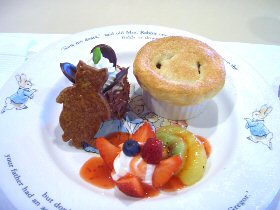 ![]() ピーターとベンジャミンの収穫祭スパゲティー あひるのジマイマのシーフードリゾット (2006.7.24 ランチの写真2点追加) どちらもとってもおいしかったです。収穫祭スパゲッティは野菜がたっぷりと入っていて、にんじんのベンジャミンとピーターがとっても甘くておいしかったぁ。でも、あれベンジャミン随分と太ってしまったね(^^;) ![]() マグレガーさんの庭の野菜たちと仔羊のロースト ベンジャミン バニーの玉葱でミートローフ ![]() こねこのトムも大好きなチキンパイ チキンパイの中からでてきたのは、ジャンボなこねこのトム。これには頼んだ本人もびっくり! ![]() ピーターラビットのピクニックセット とうとうすべてのメニューを掲載することができました。 (2006.9.6 ランチの写真1点追加) ●●デザートメニュー 11:00〜