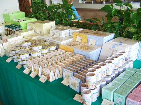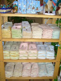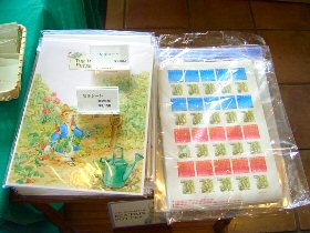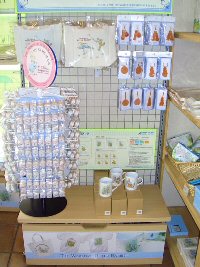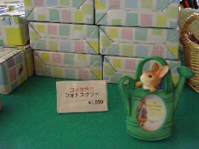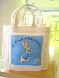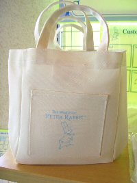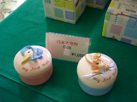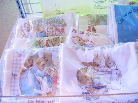 ピーターラビットのイベント期間中に、期間限定でオープンする「ピーターラビットショップ」 英国より輸入された日本未発売品を含め、数多くのピーターラビットグッズと出会える場所です。 どうぞ、この機会にピーターラビットグッズとたくさんであってくださいね。 ![]() ![]() ![]() Tシャツ 1枚 3150円 生地はとてもしっかりとしていて、着心地もよさそう。 別途申し込みをすれば、送料別で、腕の部分に名前をプリントしてくれるサービスも。 ![]() キャンパス生地のトートバッグ 表 裏 裏にはポケットがついてシルエットが ![]() (左)豪華な装丁の80円切手シート(3150円) (右)50円切手シート(1800円) 日本でピーターラビットの切手が始めて発売されました。それがこちらの2点です。 ![]() (左)手触りのよさがたまらないピーターラビットシリーズのタオル (右)ゴブラン織のクッションと、フットスツール、抱き枕にもなるクッション ![]() そして今年は、ゴブラン織製品がこんなに、いっぱい!! 左の手前から、2100円、2415円(色違い2点)、2940円、2940円、3465円、8190円などなど ゴブラン織のバッグは、ファンの間でも人気が高く、今年は小さなポーチから、マチがたっぷりある大きなバッグまで、 ゴブラン織の製品が勢ぞろいしました。 そして、今年はなんと!あのベットカバーがとうとう入荷しておりました!! サイズ170x170cm 73500円、 サイズ170x200cm 86100円 ![]() 毎年、ひとつずつ、ピーターの缶や、オリーブオイルを楽しみに購入されるという方や、 大切な家族へのおみやげにと大人気のお菓子シリーズ。 ![]() 日本未発売の輸入品。小さな小物入れと、小さなフォトスタンド。どちらもお子様の大切な思い出の品を入れるに充分な大きさです。 期間限定ではありますが、ピーターファンのためのイベントショップ。 箱根のおいしい空気と、おいしい水と、そして癒しの空間でたっぷりとリラックスし、帰りには思い出の品々を購入できる素敵なイベントでした。 (2006.7.23 ラピータの部屋コンテンツ 報告:ラピータ) |