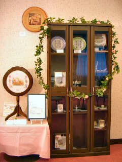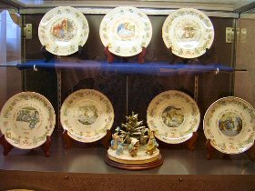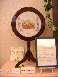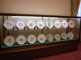 入り口正面の階段をあがった先に、ピーターラビットコレクション展示ルームがあります。 コレクション展示ルームには、、、 ![]() 入り口にコレクションルームの看板 コレクションルームの様子 ウェッジウッド社製 クリスマスプレートの展示 ![]() 1981年から、毎年1枚ずつ発売されたウェッジウッド社製のクリスマスプレート。 同じ年にバースディプレートも発売になり、ファンの間では大変人気のあるシリーズでした。 しかし、残念ながらこれらのシリーズは、2003年に製造中止になってしまいました。 今回は、コレクションしたクリスマスプレートの全シリーズ23枚をすべて展示しました。 なっつさんのデコパージュ作品 ![]() なっつさんのデコパージュ作品です。 デコパージュとは、17世紀のイタリアから始まった、自分の好きな絵や写真を切り取り、作りたいもののうえに貼り、その上にニスを塗りかさねて仕上げていく技法です。 なっつさんは、デコパージュの資格を取得され、先生として教えるかたわら、様々な素材でその卓越した技法を用い、作品を作り続けています。今回は、それらの素晴らしい作品を展示させていただております。 今回の展示物は、サイドテーブルの色に合わせたシックな棚に展示されています。雰囲気がとてもあっていて素敵でした。 ピーターラットをテーマとした手作り作品を紹介しているなっつさんのサイト 「PETER GARDEN」 http://petergarden.com/ ![]() コレクションルームでは、常時ピーターラビットと仲間たちのおはなしの上映会をおこなっています。