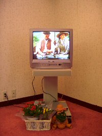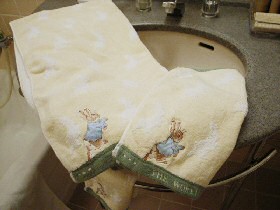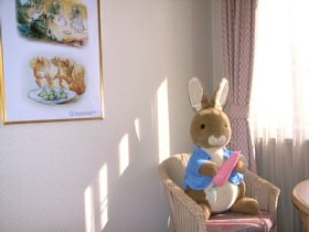 1日限定7室の「ピーターラビット宿泊プラン」 旅の予定が決まったら、まずお部屋の確認。ピーターラビットに囲まれた癒しのお部屋に宿泊することができました。 お部屋のイメージは、、、、 ![]() ![]() なんといってもゴージャスなのは、ピーターラビットのゴブラン織ベットカバー!!! そして、ゲストの到着を心待ちにしている、ジャンボピーターラビット。 ホテルの備品はもちろんピーターラビット。体重計やゴミ箱、そしてタオルまでも。 ベットサイドテーブルの上には、ピーターの絵本シリーズや湖水地方のガイドブックなども。ピーターのお話のDVDを見たりと。 ![]() 朝、目が覚めると、朝のやさしい光に包まれてピーターが「おはよう」と迎えてくれるのもいいですね。 (2006.8.9 ピーターラビット宿泊部屋の写真を追記) ![]() 宿泊特典のおみやげ 2006年は、ピーターラビット、もしくはジマイマのぬいぐるみの、どちらかを選択できるようになりました。 この他にも、装丁が見事な80円切手や、おしゃれな文庫本カバーなどがもらえます。