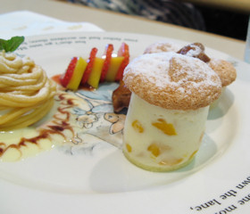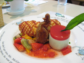 ![]() いよいよ楽しみにしていた夏恒例のイベント、パレスホテル箱根 サマープラン「ピーターラビットフェア2008」が開催されました。 期間: 2008年7月19日〜9月7日 場所: パレスホテル箱根 箱根町仙石原 www.hakone.palacehotel.co.jp/ 毎年楽しみにしているこのイベントは、イベントが始まったばかりの3連休のなか日に、ピーターラビット好きの友人たちと一緒にお茶会(世間ではオフ会とも言いますが)を開催しました。ひとりで行くと、全メニューを撮影するのは無理なのですが、そこは気の知れた友人ばかり。なるべくメニューがかぶらないように注文してくれました。おかげで、ほとんどのメニューを紹介できました。ご協力感謝です。 ●1F 「カフェ・レストラン ハミング」 ピーターラビットと仲間たちのお料理フェア(11:00〜22:00) ![]() イベント開催期間中は、このようなテーブルマットペーパーがセットされます。 上品な薄い色使いなので、この後この場所へ運ばれてくるお料理の邪魔をしません。 でもマットを汚さないように食べるのは至難の業です。(まだきれいなうちに撮影してね) ![]() 『あひるのジマイマのおはなし』出版100周年記念 あひるのジマイマのオムライスランチフェア〜〜(11:00〜14:00まで) 2008年、出版100周年を迎える『あひるのジマイマのおはなし』を祝して、あひるのジマイマのオムライスランチフェアを開催中です。 私も、せっかくですから「ジマイマのオムライス、シーフード」をチョイスしました。オムライスのなかに、ホタテにエビといったシーフードがゴロゴロと入っていて、シーフードの良いだしがでていて、とてもおしかったです。写真右は、オムライスの卵を開き、そこにケチャップで太陽を書いてみました。菜の花畑のジマイマとミニピーターってところでしょうか! ジマイマのオムライスは、味が4種類も揃いました。「シーフード」、「ビーフ」、「チキン」、「キノコ」。 キノコをチョイスした友人は、大きめにカットしたキノコがゴロゴロと入っていて、とてもおいしかったと感想をのべていました。 ![]() オムライスランチには、デザートのアイスクリームと、飲み物がつき、2,520円です。 今年から、紅茶やコーヒーのカップが、ウェッジウッドよりヤマカへと変更になりました。 ![]() 「マクレガーさんの畑で採れた夏野菜カレー」 「ベンジャミンと森へおでかけハンバーグステーキ茸ソース」 (スープ・サラダ付) 1890円 (パンまたはライス付) 2300円 ![]() 「フロプシーが大好きなお子様セット」 「やんちゃなトムのお野菜たっぷりペンネ」 (カップスープ付) 2100円 (スープ・サラダ付)1950円 ![]() フロプシーが大好きなお子様セットについていたカップスープの器は、以前と同じようにウェッジウッドのティーカップ&ソーサーでした。 この他のアルカルトメニューは、「ピーターとジマイマの具だくさんホットサンド」(スープ・サラダ付) 1890円です。 12時からメニュー選びにゆうに10分から20分はかけ、それからおみやげタイムに始まり、おしゃべりタイムへと。そうこうする内に、メニューが運ばれてきて、撮影タイムへと。例年のことですが、なかなか食べ始めるところへたどりつきません。でも、目で見てまず楽しむことができるのも、このイベント最大の楽しみなんです。 ●ピーターラビット ミニガーデン テニスコート下 芝生広場 10:00〜17:00まで ![]() ![]() ここは、ホテルの中2階にある広場といえばいいのでしょうか。ホテルの玄関脇からも行けますが、建物内部の階段をのぼり2階とさらにもう半階分のぼった先に、このミニガーデンがありました。 ミニガーデンへ続く小道を歩いていくと、ガーデンアーチに飾られたピーターラビット・ウェルカムリースがお出迎え。芝生の緑が目にとっても優しい憩いの場所へと案内してくれました。 ●スイーツフェア(11:00〜22:00) ![]() 「いたずらっこピーター」 「ジマイマのヒルトップ農園」 フロマージュ・ブランのお菓子とナッツ入り生チョコレート エクレアとセージのムース トマトゼリー添え ![]() 「ベンジャミンが森へお散歩」 ベンジャミンが森で出会ったキノコの可愛いこと! キノコの焼きビスキューとマンゴーのデザート 3種類とも単品630円、コーヒーor紅茶付き 1050円 「ベンジャミンが森へお散歩」は、森のキノコがとってもキュートなんです。キノコのカサの部分は、サクサクの焼き菓子ビスキー、そしてキノコの柄の部分は、マンゴー入りのババロア。 トマトゼリーは酸味が効いた爽やかな夏にぴったりのゼリーですし、生チョコレートはチョコレート好きも納得本格派チョコで濃厚でした。 ●1F ピーターラビット ショップ ![]() ![]() 2008年のゴブラン織りグッズのラインナップ。 ![]() ![]() ![]() ![]() ![]() 写真右側は、大人気のタイルデコシール!全部で14種類ありました!!(1枚399円) バスルーム、キッチン、カップや、食器棚にも貼ることができ、そしてきれいにはがすことも可能。 ![]() ![]() 8月3日にスペシャルイベント(15名限定)と