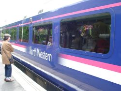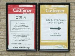 | 朝6時25分発の電車に乗るため、5時にモーニングコールを頼んでいたけれど、朝2時半に目覚める。 何度か寝ようと挑戦したけれど、眠れない。時差ぼけかなぁ。 朝5時半にタクシーを呼んでいたのでそれまでにホテルをチェックアウト。 ホテルのフロントのお兄さんは、「入口でちょっと待ってて」と、ホテルの入口前の道路脇へ。タクシーが来るまでのほんのしばらくの間そこに立っていて、タクシーが来たら、私の側に来て、スーツケースをすっと持ち、タクシーの中に入れてくれた。 ちょっとした親切がとってもうれしく感じたので、チップを気持ちよく渡せた。 英国に来て初めてやさしく接してもらい、なんだか朝からとってもHappy! タクシーの運転手に「電車に乗ってどこ行くの?」って聞かれたから、「ウィンダミア」と伝えたけれど、私の発音が悪いのかうまく伝わらない。しまいには「このままスーツケースを持って空港に行くのか」と、笑いまじりに言われてしまった。もちろん『ブラックジョーク』だと思うけど。発音って難しいな。 ラッセルスクエア ベッドフォードホテル 〜 ユーストン駅まで タクシー代 5ポンド(チップ込み) ![]() (写真説明) 左:ユーストン駅正面入口 右:行き先案内の電光掲示板 ユートン駅に着いて、これから乗る電車のプラットホームを電光掲示板で確認する。 写真ではわかりづらいですが、白い線で囲んだ部分、まずは「発車時刻」、「電車行き先」、「プラットホーム番号」、「途中泊まる駅名」などが表示されています。 朝一番の「グラスゴー行き」は、12番プラットホームに到着。 ヴァージン鉄道 「グラスゴー行き」 6時25分発 ユーストン(Euston)駅 〜 オクセンフォルム(Oxenholme)駅まで 所要時間:約3時間40分 ![]() (写真説明) ユーストン駅 12番プラットホーム改札 (といってもドアがあるだけですが) 電車のホームに入るのに、改札口みたいなドアは一応あるけれど、そこにはには誰もいない。 通りすがりの駅員さんに聞いてみると、「電光掲示板やモニターに電車が到着して、プラットホームの番号が表示されていたら、勝手に乗っていいよ」と言われたが、私が日本から準備していた『ブリットレイルフレキシーパス』は、一番最初に使用する日のみ、使用するためのスタンプを押してもらわなくてはいけなくて、これができるのは駅の窓口のみ。 電車は乗れる状態でも、窓口のおねえさんは「窓口は6時から営業よ」と言って相手にしてくれない。 6時6分にようやく窓口がオープンし、スタンプを押してもらえることにはなったが、2種類のスタンプの内、1つが紛失して見つからないようで、ここで10分もロスしてしまった。 座席の予約もしていないし、発車時刻は近づくし、英国に来て初めて心臓がドキドキ。 なんとか2種類のスタンプを押してもらい、あわててホームにむかったら、座席はガラガラで拍子抜けしてしまった。 ![]() (写真説明) スタンダードクラス座席 座席は固定式 4人掛けと2人掛けとあるが基本的に4人掛けが多かった。 電車はホーム手前から、ファーストクラス、スナック販売車両、スタンダードクラスと続き、スタンダードクラスの座席の背もたれに紙がささっていない座席がありそうな車両を探す。 いざ電車に乗るには、扉を自分で開けなくてはいけないのだが、これが取っ手を引いて外に開けるタイプ。外から開けるのはいいけど、中からドアを開けるのは大変そう。 車両入口にスーツケースを置く専用スペースが設けられているので、そこにスーツケースを置き、車両の半分ぐらいの座席に「予約席」の紙がささっていたが、紙がささっていない窓側の座席をゲット。 これでひと安心。 6時25分少し前に車掌より行先と泊まる駅名のアナウンスがあり、定刻になると発車のベル音もなくスッーっと電車は走り始めた。 天気は「晴れのちくもり」ジャケットがないと電車の中は少し肌寒いぐらい。 最初は快調に飛ばしていたが、だんだんスピードが落ちてきて、とうとう途中で止まってしまった。 この分だとウィンダミア駅到着は遅れるかなぁーって思っていたら、電車が止まった線路脇の菜の花畑から、オレンジのネザーランド・ドワーフがピョコンと姿を現し、もう感激!! こんなに早くピーターラビットに出会えるなんて。あわててカメラを用意するも、その後すぐに電車が動き出し、電車が動く音にびっくりしたうさぎは、すぐ菜の花畑の中に隠れてしまった。 このうさぎに会うために電車が止まってくれたのかなと思うような演出に思わず心の中で拍手。 ![]() (写真説明) 左:オクセンフォルム駅(後ろに移っているのがグラスゴー行き電車) 右:乗り換えの日本語表示案内版(日本人観光客が多い証拠だね) 電車の乗換駅は、オクセンフォルム(Oxenholme)駅 10時5分定刻通りにオクセンフォルム駅に到着。 電車を降りる際、電車のドアの窓は既に下にさがっていたけれど、そこから手を伸ばし、外の取っ手を下に下げるのがひと苦労。背も高い方だし、手も
