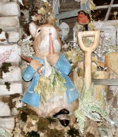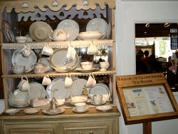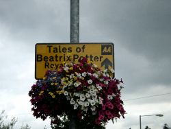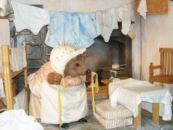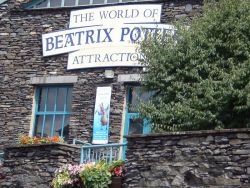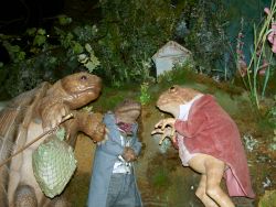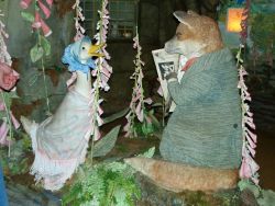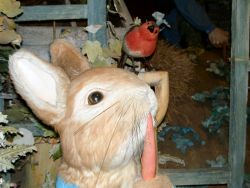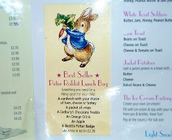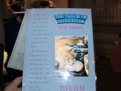 ![]() (写真説明) 左:ポターアトラクションへの案内標識 右:ボウネス桟橋近くに横付けされていたバイク型タクシー (こんなタクシーでドライブしたら気持ちいいだろうな。運転手はもちろん皮ジャンでばっちり決めている) 再びボウネス桟橋から、目指すは「ポターアトラクション」(World of Beatrix Potter Attraction) ポターのアトラクションはこちらという標識を見つけたまではよかったけれど、まわりにはうさぎアンテナがピコピコ反応するかわいいお店がずらり。見たい気持ちをぐっと押さえ、目的場所を探すが見つからない。 方向を間違えていたらまた二度手間と思い、ボウネス桟橋のおみやげ屋さんで道を尋ねることに。 飲み物とか絵葉書、おみやげものを置いている小さなショップ。ここでジマイマのウィンドウ飾りシールを発見。ピーターラビットのロゴ入りの飾り用ディスプレイ専用台があったけれど、そこに飾られているのはピーターに関係ないものばかり。いかにもピーターラビット&フレンズで廃棄処分したものを拾ってきて利用しているってそんな感じがして思わず苦笑。 ここのおじいさんにポターアトラクションの道を聞いたら、とってもわかりやすい地図をくれた上に、丁寧に道を教えてくれた。英国で何か困った時は紳士に聞くという鉄則が、この時私の中できた気がする おじいさん、ありがとう! その時にもらった地図はこちら。。ボウネス周辺地図 ![]() ビアトリクス・ポターの物語のシーンをリアルに再現したアトラクションです。 今年は創立10周年記念ということで、特別な展示物もありゆっくりと楽しむことができます。 The World of Beatrix Potter Attraction 住所:CragBrow,Bowness-on-Windermere 営業:定休日無し 夏期:10時〜Late(5時以降も営業) 冬期:10時から4時半まで 入場料: 3.50ポンド (10周年記念特別展示入場料: 1.50ポンド) まずはお腹がぺこぺこだったので、ポターアトラクション内にあるティールーム「TAILOR OF GLOUCESTER TEA ROOM」へ。 ![]() (写真説明) 左:ティールームのメニュー表紙 右:メニュー ランチボックスのピーターのイラストにつられてつい グロスターの仕立て屋で統一されている店内。メニューにも。 メニューにおすすめとなっていた「Peter Rabbit Lunch Bag」を頼んだら、お子様向け、それも最近の子供でも食べるかどうかというメニューだった。がっかり。 ![]() (写真説明) 「Peter Rabbit Lunch Bag」の中身。 2.35ポンド りんご、まずいオレンジジュース、薄いサンドイッチ、ポテトチップ、小さなバッジ きっと足りないだろうから、追加で注文しなくっちゃと思っていたけれど、りんごを完食したらお腹一杯になっちゃった。 ![]() せっかくなのでティールーム内も撮影。 ティールームのディスプレイ用飾り戸棚。食器の中には猫のシンプキンが隠しておいたねずみ達が「だしてー」ってカタカタと今にも音を立てそうな感じだ。 仕立て屋のおじいさんや猫のシンプキンの大きなフィギュアも飾ってあり、子供が塗り絵して遊べるようにクレヨンとかも用意してある。 店内に展示してあるものはどれも、グロスターのお話をそのまま思い浮かべるものばかりで、絵本の世界に自分がいるみたいな感覚になる。 まわりの音が遮断され、フッっと時が止まるそんな瞬間。いいよねぇ。 お腹もいっぱいになったので、いざアトラクションへ。 アトラクションの入場券に、初めてトラベラーズチェックを使ってみた。50ポンドのチェックは使用できないけれど、20ポンドならOKとのこと。パスポートが必要で、パスポート番号や名前などをトラベラーズチェックの裏側に店員が記入していた。 創立10周年記念ということで、チケット売り場で子供にだけ渡されるプレゼント「ピーターの耳マスク」 恥ずかしいけれどこの耳が欲しくてお姉さんにちょーだいって言ってしまった(^^;) 子供サイズだから手で押さえてないと止められないんだけれど、恥ずかしいから家に帰ってからかぶってみました。 ![]() チケットを購入すると、しばらく入口で待たされる。最初の5分間は「ピーターラビットのお話について」のビデオの上映があり、前の人の上映が終わるまで入口前で待機。 入口の上には、ナトキンの兄弟達が「早くおいでよ」っとこっちをチラッっと見ていて、その横には「10周年おめでとうバースディケーキ」を囲んだピーター、モプシー、カトンテール、フロプシーとお母さん達の姿が。 あとで写真撮影しようと思っていたらすっかり忘れちゃった(^^;)すごくかわいかったのにな。残念。 最初の5分間のビデオ上映は、「ピーターラビットのお話について」 お話誕生秘話とか、ポターが実際に飼っていたうさぎのこととか。とってもシンプルにまとめられたビデオ。後ろに用意されたヘッドホンをつけると日本語解説が流れます。 ![]() 5分間のビデオ上映が終わるといよいよ物語に登場する場面そのままに、その物語の登場人物のお人形が展示されている場所に移動。 ポターアトラクションの写真はよく湖水地方の旅行記で見