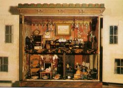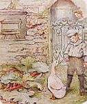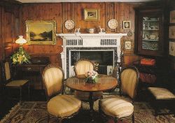 いよいよ、ヒルトップの中をご案内します。 ヒルトップ内はカメラ撮影禁止です。ヒルトップ内のポストカードを少し購入しましたので、そのポストカードをまじえながら感激の1時間あまりを紹介していきます。 「玄関広間」 入口を入るとすぐ受付のお姉さんが立っていて、靴にカバーをかけることを指示されます。この時の注意点は必ず玄関マットの上で靴にカバーをかけること。 次に待っている人のためにと道を譲る必要はありません。一人ずつ順番に靴にカバーをかけますので、玄関マットの上にて必ずカバーをかけてくださいね。 私はリュックサックを背負っていたのですが、リュックや大きなカバンは必ず手にかけるようにして持つようにといわれます。私は受付にリュックを預かってもらい、身軽になって見学しました。 ヒルトップ内部は、とても暗く、天井も低い。身長170cmの私が手を伸ばしたら天井に手がつきそうなぐらい。とってもこじんまりした小さな家なので、ひと部屋に見学者5人も入ればもういっぱいになりそうなそんな感じです。 ![]() 「BEATRIX POTER AND HILL TOP」日本語解説書より The National Trust 入口入ってすぐ左側には、あかり取り用の出窓、この出窓に絵本でお馴染みの花が植木鉢に植えてありました。花の名前をお聞きしたら「Geranium(ゼラニウム)」だそうです。 (参照)「こねこのトムのお話」 タビタお母さんがお友達を出迎えるシーン 増築された部屋への入口につけられた見覚えあるノッカー。これはもしかしてと尋ねると、やはり絵本にしっかりと登場しているノッカーで、「コレクト」とおしゃってくださいました。絵本ではもっと大きなノッカーを想像していたのですが、絵本で見るより一回り小さかったです。(見た目の寸法ですが、縦3cmx横2cm)それにしても変な顔。魔よけの意味もこめられているのかな。 (参照)「パイがふたつあったお話」 ダッチェスが花を抱えてリビーの家をノックする。そのドアについているノッカー こねこのトムがママに見つからないようにと隠れ場所に選んだ暖炉。ポターは暖炉の中をのぞきこみながらスケッチしたのだろうか。暖炉の火が消えている時期といえば夏、短い夏にスケッチしたのかな。 (参照)「ひげのサムエルのお話」 暖炉に隠れたために、すっかりねずみ嫌いになったトム。続きは絵本で。 暖炉の前にはポター愛用の靴。私の靴と大きさを比べてみたら、とっても小さい。小柄な女性なんだってことを改めて認識。暖炉の上には皮製のピーターの人形。ポターは本の版権だけでなく、その本に関するキャラクター製品についても興味を持ち、自ら商品開発を手がけたといいます。 この皮製ピーターも自作なのかもしれません。 その横には、木で作ったうさぎの人形。手と足と顔が胴体に一箇所だけで留められ、たぶん自由に動かせるようになっている。これはプレゼントされて、お気に入りなのかな。 暖炉の右脇のもうひとつのドアについているランニングピーター姿の「ウェルカムボード」。そこに刻まれた文字は、「Calendar for 1920」となっていた。これはきっと後からつけられたものに違いないけれど、手作りなのか、とってもステキな作品だった。 ![]() 「BEATRIX POTER AND HILL TOP」日本語解説書より The National Trust 食器棚というよりは、食器飾り用戸棚。その前を走り去るのはアナマイラ。サムエルやアナマイラみたいなこわいねずみが出る家に住みたくはないけれど、とても古い家だからもしかしたらね。 (参照)「ひげのサムエルのお話」 アナマイラがねり粉を持って走りさるシーン 食器飾り用戸棚には、「母うさぎと5匹のベビーの絵柄の鍋敷き」と「ロップイヤーと5匹のベビー」の絵柄の鍋敷きが飾ってありました。この鍋敷きを見つめている内にピーターラビットのお話を思いついたなんてことは、私の勝手な想像です(^^;) 食器飾り用戸棚の横には、オーク材の柱時計。「Tow Barrow Stockport」という文字が。ガイドブックを読むと、1785年にStockportのThomas Barrowが作った作品となっていました。この柱時計の文字盤は とても200年前のものとは思えない洗練されたおしゃれな作品でした。 (参照)「グロスターの仕たて屋」 暖炉と反対側にある食器棚には、「うさぎ3匹」の絵皿、ろうそくが3本立てられる燭台、うさぎとかえるの置物。 「応接間」 ![]() ヒルトップショップ内で売られているポストカードより 0.35ポンド 玄関広間のとなりの部屋です。大理石の暖炉がひときわ目立つ存在で、先ほどの玄関広間とはガラリと雰囲気が変わります。 この暖炉の中の飾り部分にも、おもしろい顔をした小さな銅像のようなものが飾られています。あんまりおもしろい顔なのでこの顔をスケッチしたけれど、あまりに下手すぎておみせすることはできません(^^;)その銅像は左右にあって、それぞれ違う顔をしています。その間には、何故かまつぼっくり。意味があるのでしょうか。 この部屋は、先ほどの玄関広間とは違い、とても明るく感じました。ここ