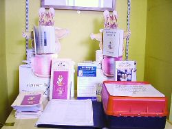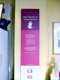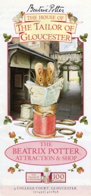 ▼インフォメーションセンターの中も外も インフォメーションセンターがある通り周辺は歩行者天国になっていてとても歩きやすかった。 ![]() (左)グロースターインフォメーションの概観 (右)ショーウィンドウには『グロースターの仕たて屋』出版100周年ディスプレイ ![]() (左)インフォメーションセンター内も『グロースターの仕たて屋』出版100周年をお祝いするディスプレイがいっぱい (右)原画を複製したプリントが何点も飾られている ![]() 出版100周年を記念して作られてパンフレットや、ポスターの種類の多さからも、町をあげて『グロースターの仕たて屋』をお祝いしているムードが伝わってくる。特に左の縦長ポスターは色目が渋く素敵でした。 ![]() 糸巻きポップに、絵本がくっついたものも。パンフレットも紫色が表紙で、今回の旅行のテーマーカラーと一緒。日本でのポップ制作はピーターが中心で、他のキャラクターは仲間たちとして描かれるぐらい。グロースターの町のポップはピーターの姿無し。こんなとこからも町を押して愛されているお話ということが伝わってきた。 ▼グロースタータウンマップ インフォメーションセンターで配布されていた、出版100周年の記念ロゴ入りの2003年版ポター・アトラクションのリーフレットやグロースタータウンマップ。 ![]() The House of The Tailor of Gloucester(グロースターアトラクション)2003年版リーフレット(写真左) グロースタータウンマップリーフレット(写真左) ![]() グロースタータウンマップリーフレットに掲載されている市内の地図。大きいサイズの地図をご覧になりたい方は地図をクリックしてください。水色に塗られた部分は歩行者専用道路。ホテルは このタウンマップリーフレットには、お得なチケットがついていてショッピングセンターで10%オフや、ミュージアム入場料半額チケットなども付いていた。 町に着いたらまずはインフォメーションセンターで情報を仕入れるが英国を旅する基本で、ニアソーリーのような小さな村にはありませんが、観光施設のある町にはほぼあります。たまに郵便局がインフォメーションセンターを兼ねている場合もあります。 ▼配布されたリーフレットからも力のいれよう 驚いたのはグロースター市が発行しているリーフレット。この町がモデルのお話が出版100周年を迎え、町をあげてお祝いしますよとリーフレットを制作されたのだ。 ![]() The City of Gloucester(グロースター市)が発行したもので、「出版100周年記念してグロースター市でビアトリクス・ポター関連のイベントを開催します」という案内が掲載されている2003年版リーフレット表紙(写真左) (写真右 リーフレットの中面の一番上の部分)リーフレットの見開きに大きな文字で以下のような紹介文がありました。 'I have made you a story all for yourself...I heard about it in Gloucestershire, and that it is true! at least about the tailor, the waistcoat, and the "No more twist!"'. ビアトリクス・ポターがフリーダ(ムーア家の次女)に宛てた手紙1901年クリスマス (私はあなただけのために物語を作りました。とっても不思議なことにこれはグロースター州で私が聞いた話で、本当のことなんですよ。少なくとも仕たて屋のチョッキについてはね。そして「あな糸がたりぬ」と言った部分も。) 「作者本人がグロースターで起きた本当の話だったんですよ」としたエピソードが『グロースターの仕たて屋』というお話となり、出版100周年の記念すべき年にグロースターにやってきた私達。まさかこれほどまでに、このお話が市民に愛されクローズアップされているとは夢にも思わずやってきたので、「すごいね、すごいね」と言葉にならない私達。 湖水地方でも各ショップで、グロースターと、りすのナトキン出版100周年記念アイテムがたくさん販売され盛りあがっていたけれども、ここは町そのものがお祝いムードに包まれているという雰囲気がひしひし伝わり、グロースターに到着し、インフォメーションセンターで既に興奮最高潮状態へ。 |