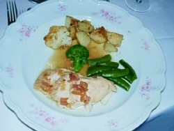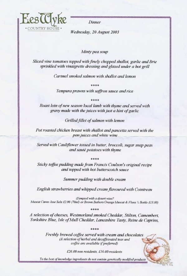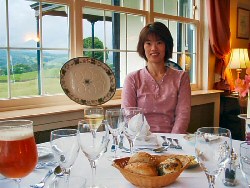 ▼Ees Wyke Country HouseのDinner 散策中は寒さも感じず、興奮しきって疲れすらあまり感じなかったのに、宿に戻った途端心地よい疲労感が押し寄せる。そして椅子に腰掛けた途端、お腹の虫が演奏を始める。 ![]() (写真)Ees Whke Country Houseのディナー用のウェイティングルームにて ディナーの準備がととのうまで、ウェイティングルームで食前酒を楽しむのが英国流。私は白ワインをセレクトしてもらい、ソファに腰掛けていただく。宿泊客はみな同じようにウェィティングルームに集まり、ここで顔合わせとなるのだ。顔を見合わせたら、どちらかともなく会話が始まり、今日は何をしたとか、出身はどこ?みたいな話をするのだが、私にはとても無理。挨拶を笑顔で乗り切り、後は雑誌を読むふりをする。 ディナーの準備がととのい、いよいよテーブルへ。 テーブルの上にはプリントアウトされた用紙が置いてあり、日付入りで当日に用意されたメニューがずらりと書いてある。着席すると、宿のオーナーご夫人がやってきて、メニューの中から、スープ、メイン、デザートのどれがいいか選ぶのだけれど、これがまた難しい。食事前のこの作業はつらくて、涙がでそう。 8月20日の Dinner Menu・・・用意されたプリントアウトされた用紙(←クリック) この用紙を見て、*印毎に仕切ってある中より一品選ばなければいけない。 一番上の3品の内いずれか(スープ、サラダ、サーモン) 2番目は1品のみ(天ぷら) 3番目はメインの3品の内いずれか(ラム、サーモン、チキン) (いずれも、カリフラワー、ブロッコリー、豆、ポテトはついてるよという説明書きも) 4番目はデザート(タフィプリン、サマープリン、いちご) 最後は、別料金でチーズ各種があるよ。 コーヒーとチョコレートはサービスよと書いてあったらしい。 これらの品を選ぶのに、悪戦苦闘。メインは、ラム、サーモン、チキンの3つの中から好きなものを選べばいいのでそんなに難しくないって普通は考えるけれど、そこには落とし穴が。どのような味付けをしているかまで調べないと、とんでもなく甘いソースのかかったチキン料理が運ばれてきたりするのだから恐ろしい。もちろん、日本のメニューのように写真付きのメニューなんて存在しない。英語でびっしりと書かれた用紙を何度眺めても頭の中に入る訳はなく。。。ええい、どうにでもなれーという気持ちになり、ワインをごくりと飲み干す。 ![]() (写真左)Minty pea soup えんどう豆のスープ 生クリーム添え 濃すぎず、薄くもなくおいしかった (写真右)Tempura prawns with saffron souce and rice 海老の天ぷら 焼きおにぎり付き この日は日本人客が2組ということもあり、日本食を用意してくれたようだが、しかし、うーむ。天ぷらには塩味で下味がついてないし、サフランソースでは物足りないし。そして焼きおにぎりのつもりなのか、ライスプディングみたいなものもまったく味なし。「おお、日本食が食べれる」と期待しただけに、みんなで落ち込む。落ち込みながらも、食べられない味ではないし、食べられる味というだけでも良しとしなきゃと、気を取り直す。 ![]() (写真左)Pot roasted chicken チキンのワイン蒸し、チキンの上に乗っているのがエシャロットらしい。これはシンプルな味付けでおいしくいただけた。 (写真右)Sticky toffee pudding べっとりべたつくプリンというよりは、砂糖の固まりにコーティングされたケーキ。それも砂糖1袋分ぐらい使ったじゃないかと思うぐらい口の中でべたつく。まったく違うものを想像していた私は、目の前にこの皿を置かれた時は目が点になってしまった。「なんじゃ、こりゃぁ」と叫びたくなってしまった。だってプリンて書いてあるんだもん。目が点になりながらも、恐る恐るひと口。「ぎゃぁぁぁぁぁ〜」脳天がぶち抜かれそうな甘さに仰天!! ひと口食べただけで残りを食べるのは無理と思いながらも、英国の伝統菓子で英国人は大好きという話を聞くとまた口に運んでしまう。その度に「ぎゃぁ」って思いながら。でも、一度脳天をぶち抜かれた後なので、甘味を認識する感覚が狂ってしまったらしい。スプーンでほんの数ミリずつ削って食べていたのが、気づけばひと口サイズが大きくなり、半分以上食べた頃には、味覚がなくなり普通に食べられるように。 ![]() (写真)友人が選んだデザート。English strawberries 生クリームでコーティングされたいちごのデザート。こちらは甘酸っぱくておいしかった〜。いちごにしておけば、クラクラすることもなかったのに。 メインが英国には珍しく(失礼)おいしい味付けだったので、最後のデザートがなんとも残念だったけれど、タフィープディングも日本人向けに甘さ控えめに作ってくれればおいしかったはず。今となっては英国人が大好きな湖水地方の伝統的なデザートを体験できてよかった。 が、しかし・・・もしまた湖水地方に旅行する事があっても、 Sticky toffee puddingは二度と口にしないぞと誓うのであった。 食事が終わると、別室のウェイテ