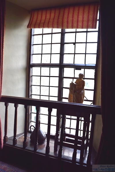 ▼ヒルトップハウスの2階へと通じる階段は18世紀に付け替えられたもの 英国 湖水地方ニアソーリーにあるヒルトップ農場のヒルトップハウス内部見学で、1階を見て回り、2階へとつながる階段にもたくさんのエピソードがあり、しっかりと見ておきたい。 ヒルトップハウスの2階へと続く階段(The Staircase)は、最初から取り付けられていたものではなく、途中で付け加えられたものだった。17世紀末に建てられたヒルトップハウスは、玄関ホールに小さな螺旋階段(spiral staircase)が取り付けられていた。 ![]() 18世紀、現在の階段部分が増築され、途中に踊り場がある折り返し階段に付け替えられた。階段の手すりは緩やかにカーブし、手すりを支える手すり子は、シャープな角材の間に木材を回転させテーブルの脚のように丸く削りとられた手すり子が並ぶ、とてもエレガントな手すりがつけられた。 ▼踊り場の装飾品 ![]() 階段の折り返し部分にある踊り場は、畳一畳分ほどのスペースがあり、手すり子と同じように丸く削りとられた木材で仕切られた柵があり、外壁部分に高さ2メートルはあろうかと思われる格子の枠がはめ込まれたガラス窓より、薄暗い玄関ホールに明るさを届ける。ビアトリクスは、階段の踊り場から玄関ホールまで明かりが射しこむ大きな窓と、エレガントな手すりがついた階段を気に入っていた。 ![]() 『ひげのサムエルのおはなし』の冒頭、タビタお母さんがトムを探している場面で階段が描かれた。この場面でタビタお母さんの後ろに描かれたのは、踊り場に設置された「ロングケース・クロック」。 ![]() ロングケース・クロック(Longcase clock)は、高さ2メートル50センチあり、現在はホール・クロックと呼ばれる振り子時計で、アメリカの呼び名はグランドファーザー・クロック。18世紀のショーフィールド社(Schofield)のもので、ビアトリクスは「時計の音はゆったりとした心臓の鼓動のよう」と、結婚後住居をカースルコテージに移してからも「古い家が寂しくないよう付き添いに行く」と、毎日のようにヒルトップハウスに出かけたそうだ。 ![]() 大きな窓の前に19世紀初頭に活躍したイタリアの彫刻家ピエトロ・マーニ(Pietro Magni)の「本を読む少女」の摸刻像(本物よりひと回り小さいサイズ44x27センチ)が飾られている。この像の飾り台としてビアトリクスが使用したのは、「棺(coffin)」と呼ばれる17世紀のスツール(coffin stool)。 「地元で棺桶をスツールの上に載せ、そのスツールのことを棺桶スツールと呼ぶ」ことから、そんな名前がつき、スツールを使用するのはご遺体をネズミから守るための風習が残っていることからだそうだ。座面の四方が折りたためる長方形の椅子のことで、彫像の下のスツールも見逃せない逸品(珍品?)だ。 ![]() 踊り場の窓より眺められるニアソーリー村の景色。ビアトリクスも何度となく眺めたであろう場所に自分が立っていると思うだけで感慨深い。 ▼挿絵に描かれた同じ目線で撮影しよう ![]() 階段を上った先は、『ひげのサムエルのおはなし』でサムエルがめん棒を転がし運ぶ場面に描かれた。 ![]() そうそう話が前後するけれど、めん棒の前にバターも失敬したサムエル。こちらは階段の上り口部分が描かれ、大きな窓から射しこむ光が眩しい中、ネズミの通路を通らずにふてぶてしく階段を上るサムエル。もし挿絵と同じ角度で撮影するならば、階段の左側の一人立てるだけのスペースがあるところから撮影すると、階段の向きが挿絵と同じになる。 『ひげのサムエルのおはなし』はヒルトップハウスの内部が詳細に描かれていて、私達訪問者を絵本の世界へといざなってくれる。 |