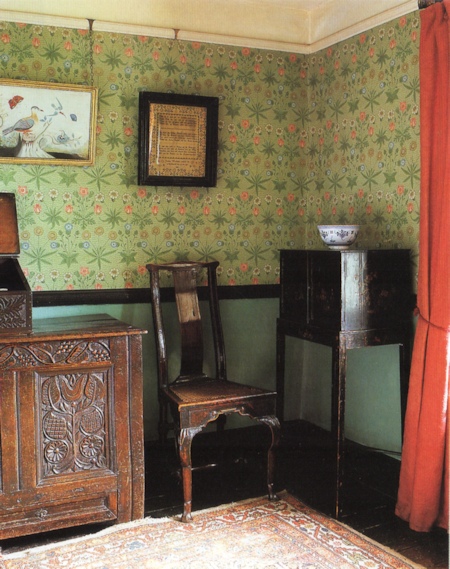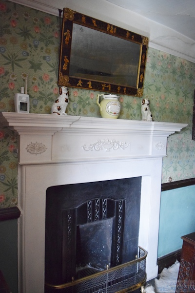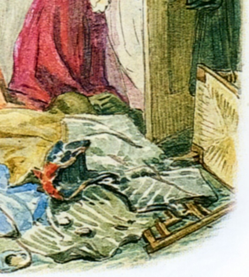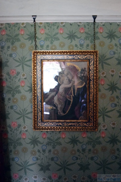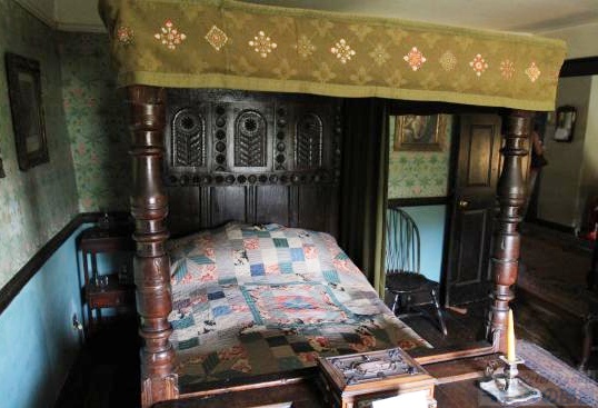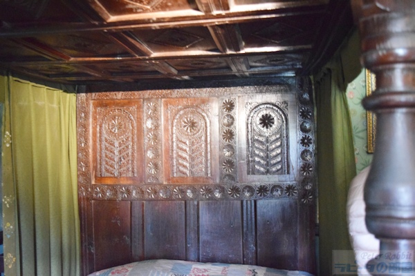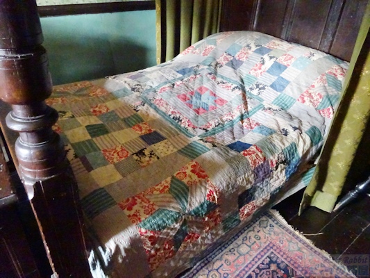 ▼2階で見学できるのは4部屋あり、まず寝室へ ビアトリクスが本の印税と、叔母からの遺産を資金にヒルトップ農場を購入したのが1905年。それまでに既に6冊の絵本を出版し、1907年出版の『こねこのトムのおはなし』、1908年出版の『ひげのサムエルのおはなし』『あひるのジマイマのおはなし』からヒルトップ農場や、ヒルトップハウス、農場のあるニアソーリーが絵本の舞台として度々登場する。 と、これまでの大事な年号をおさらいをして、さて続きを。 ヒルトップハウスの2階は、寝室、宝物部屋、プライベートの居間、ニュールームの4つの部屋が公開されている。 ![]() まずは寝室へと足を踏み入れた。ベッドの横に置かれているのは「アメリカン・ウィンザーチェア(Windsor chair)」で、シェーカー教徒が1800年頃に作ったシェーカー家具。ビアトリクスはこれを「永遠に残すべきもの」と思うほど特筆すべき素晴らしい椅子。 ▼見事な模様が施された天蓋付きベッドは1914年頃に購入したもの 寝室の場面で真っ先に思い出すのは、『こねこのトムのおはなし』で、「悪いことしたこどもはベッドで寝ていなさい」と寝室に閉じ込められる場面に描かれたベッドを思い出す。当然、この場面で描かれたベッドが寝室にあるのかと思いきや、さにあらず。『こねこのトムのおはなし』が出版されたのは1907年。寝室のベッドを購入したのは、ビアトリクスが結婚して住居をヒルトップハウスからカースルコテージに移り住んだ1914年頃。 ![]() 改めてベッドを見てみると、4つの柱で支えられた17世紀の湖水地方産 天蓋付きベッド(Four-poster bed)で、天井部分はひし形に彫られたパネルが16枚はめこまれ、へッドボード(Headboard)にも見事な模様の彫刻が掘られている。 ベッドの周りを囲うようにかけられている濃い緑色のダマスク柄生地のカーテン(Bed hangings)は、カーテン上部のレールが見えないように覆うヘッドクロス(Head cloth)もセットになり、そのどちらにも花柄模様が刺繍されている。 ![]() この刺繍は、ビアトリクス本人が金襴ブロケード(今風に書くと、カラフルな絹糸)で刺したもので、「外にあまり出かけられない私にとって刺繍することは良い娯楽」と晩年70歳を迎える前より刺し始めたもの。 1914年以降の作品でベッドが描かれているのは『妖精のキャラバン』の口絵で、緑色のカーテンとお揃いの生地のヘッドクロスも描かれた天蓋付きベッドがある。まったく同じではないものの雰囲気はそっくりだ。 ▼寝室の壁紙はウィリアム・モリスのディジー模様 ![]() さらにこの部屋の最大の特徴である壁紙は、ウィリアム・モリスのデイジー(ヒナギク)模様。他の部屋と違って、モールディングで仕切った上部にデイジーの壁紙、下の部分は同系色の模様無しと貼り分けている。 ビアトリクスはモリスの壁紙について「水彩画作品や写真など飾る場合にはとても不向きな壁紙、でも天蓋付きベッドの背景にはとてもふさわしい壁紙」と語った。 ![]() パッチワークのキルトカバーも同じくアメリカ製。 ![]() 椅子といえば、冒頭の『こねこのトムのおはなし』で寝室に転がっていた椅子。 ![]() 寝室のベッドと反対側の壁、ブランケットチェストの脇に置かれている1700年代のウィリアムアンドメアリー様式の椅子は、座面が籐(cane-seated)を編み込んで作られたもの。もしかしたらこねこのトムたちが暴れてひっくり返した椅子はこの椅子かと思ったら、絵本に描かれたものとは少し違っている。 後日、ナショナルトラストコレクション(←ここをクリックするとコレクションが見られます)から、絵本に描かれたそっくりな椅子(座面の膨らみ具合や背もたれのデザインなどから)を見つけた。座面がイグサで編み込まれた1800年代の椅子。ホークスヘッドにあるビアトリクス・ポター・ギャラリーにて展示されていることになっているが、入ってはいけない扉の向こうにあったので撮影できなかった。 ▼寝室の装飾品 ![]() 壁に掛けられたオウムと鴨の3枚の絵画をひとつの額に入れている作品は、サミュエル・ディクソンのグワッシュ画法で描かれた1750年頃の作品。この作品の裏にビアトリクスのメモ書きで「子どもも見ると思うからオウムの作品(真ん中)の上に描かれた蝶を取り除くべき」とある。確かに空を飛ぶ見た目がクラゲのような蝶で不思議な感覚に陥るので、最もな意見かも。 ![]() ビアトリクス自身が刺繍したベッドカーテンとは別に、寝室には二つの「サンプラー」と呼ばれる刺繍作品がオウムと鴨の作品の両脇にかけられている。 サンプラー(280x270mm)は、手芸の技を磨くため、色々な柄やアルファベットを寄せ集めたデザインのことで、ビアトリクスはこれをどのような経緯で入手したのかまでは分かっていないものの、金色の糸のみで仕上げた縫い目がとても細かく、またモチーフの位置決めの正確さなどから仕上げた人の技術の高さが伺える作品。もうひとつのサンプラー(←ここをクリックするとコレクションが見られます)は