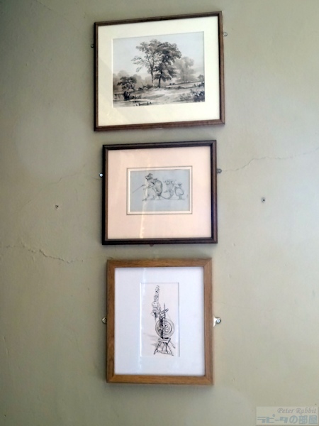 ▼ヒルトップハウスの2階ニュールームへ ![]() 階段を上り、階段に背を向けた右手側、人とすれ違うのも難しい狭くて暗い廊下を進んだ先に、明るく開放的な比較的大きな部屋「ニュールーム」とビアトリクスが呼んだ部屋がある。 この部屋は、1906年にビアトリクスが増築した2階部分で、他の部屋よりも約60pほど天井が高く、壁2面に窓があり、明るく開放感を感じる部屋だ。最初「図書室」と呼んでいた頃は、弟バートラムの大きな作品(油絵100号サイズ)を飾るためだけに使用していた。 ![]() バートラムの作品は、結婚後移り住んだスコットランドの景色を描いたもので、姉のビアトリクスが手のひらサイズの小さな作品が多い中、大きさだけみても対照的だ。こうした作品は、絵描きとしていつかは大作を描いてみたいという願望からか、それとも絵本作家として成功した姉には描けないものをと思ったからなのか、1918年46歳で亡くなった弟を偲ぶかのようにヒルトップハウスのニュールームに運ばれた。 この部屋で真っ先に目が奪われるはこうしたバートラムの特大サイズの作品4点だろう。作品と作品の間に、モダンな飾り柱(ピラスター)が仕切りのように取り付けられている。 ▼挿絵にも描かれたアンティークチェア 図書室として呼んでいた頃はあまり使用されることのなかったこの部屋が、書き物机やビアトリクスの好きなアンティーク家具を配置することで、ヒルトップハウスの中でほぼ毎日のように執筆活動する部屋となった。 ![]() 書き物机の前に配置されているアンティークチェアは、19世紀ドイツの家具職人ミヒャエル・トーネット(Michael Thonet)の作品、ベントウッドチェア(曲木椅子 bentwood chair)で、祖母ジェッシーがカムフィールド・プレイスで使用していたもの。 ![]() このベントウッドチェアは、『ねずみが3びき』という1892年の未発表作品(おはなし全集の改訂版に掲載)に描かれた。 ▼ヒルトップハウスで最も質問が寄せられる展示物 ![]() 書き物机の上にあるのは、サギ科の仲間「ヨシゴイ」の標本。ヒルトップハウス内でゲストに最も質問されるものとして紹介されているスタッフブログによると、この標本もその内のひとつだそうだ。 ![]() 反対側の壁には蝶の標本も展示され、ビアトリクスが熱心に調べたであろう1633年出版の「ジェラードの本草書(Gerad's Herbal)」などもあり、ビアトリクスの博物学への探求心を垣間見ることができる部屋。 ▼ビアトリクスのコレクションに日本の根付が ![]() 壁に吊り下げてあるキャビネットの内のひとつは、チェスの駒、象牙の置物などがあり、 ![]() その中でも特に興味深いのが象牙製の根付が数点あること(棚の上から3段目、左から、福禄寿、獅子、親子牛、琥珀色の目をした兎の4点)。 ビアトリクスと日本といえば、ビアトリクスの1882年(16歳)の作品に、歌川広重の練習「諸職画通三篇」の背表紙が描かれていることが分かり、河野先生がこの発見を2014年にプレスリリースされた。 ![]() もうひとつの食器類が並べられているキャビネット内の隅にあるのも、日本製の浮世絵絵皿と、戦国武将柄の蓋付きコーヒーカップ(1900年製)がある。ビアトリクスのお眼鏡にかなったものの中に、日本のものも含まれているという事実があるだけで嬉しい。 ![]() こちらも小さくて見逃してしまいそうだが、現地では「Monkeyの根付」と紹介されているもの。平戸焼の三番叟(さんばそう)の根付と判明(高さ7.5cm)。写真ではぼんやりしているが、とても可愛らしいものなのでぜひチェックしてもらいたい。ビアトリクスがどういうきっかけで根付を集めたか知りたいと思うのは私だけではないはず。 そういった棚の中にあるものも目を皿のようにして楽しめるということは、マニアックな世界へさらに足を一歩踏み込んでしまったようだ。 ![]() 食器棚にはルビー色のアンティークグラス(一番上の棚)があり、ワインを嗜むこともあったのだろうかと想像が広がる。食器棚の上から2段目の左にあるのは、父ルパートの絵付けによる脚付きカップと、その奥にソーサーがあり、ビアトリクスが6歳の頃の思い出の品だ。 ![]() 食器棚を覗きこまないと見えない下段にあるのは、ちょっと珍しい1690年創業のフランスの陶器メーカーで、アンリオ・カンペールの民族衣装を着たデザインの靴の形をした器や、白鳥の形などをした入れ物やトレイなどがある。 ▼ニュールームには家族の作品が展示されている ![]() この部屋には弟バートラムの作品だけでなく、家族全員の作品が勢ぞろいしている。上から母ヘレンの湖畔の景色を描いたもの、父ルパートの「3匹の盲目ネズミ」、ビアトリクスの「糸車」とある。家族共通の趣味が絵画であり、芸術家一家という側面も改めて垣間見ることができる。 ![]() この部屋の紹介冒頭に戻り、壁2面に窓があるという部分、部屋の入口を背にした右側の窓に注目すると、何やら窓の前で作業をされていたスタッフの方が快く立ち上がって、窓からの景色が見えるよう