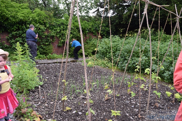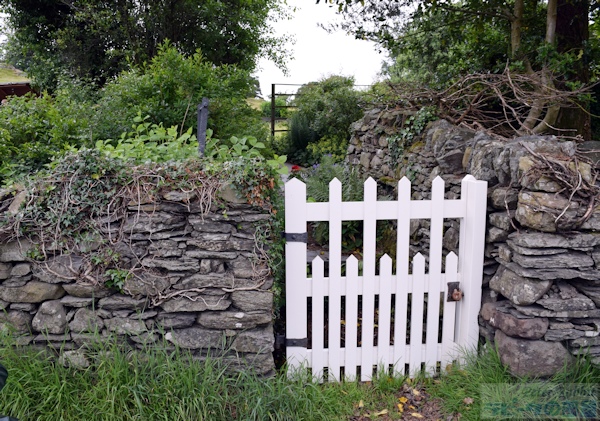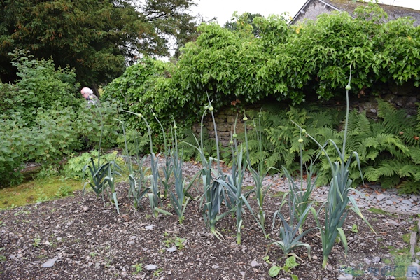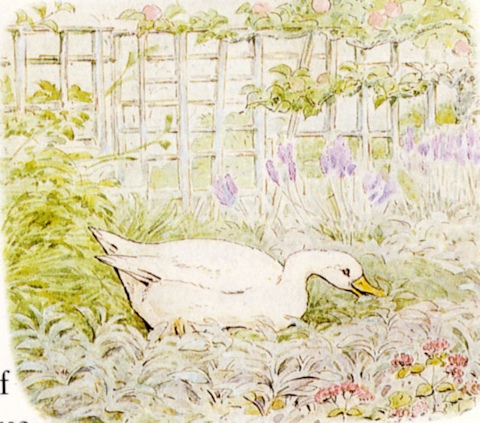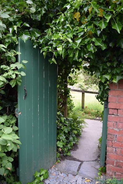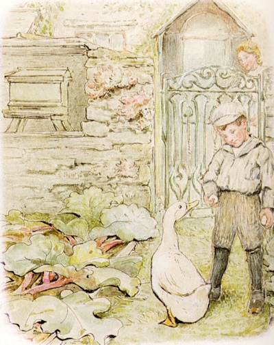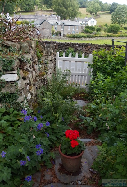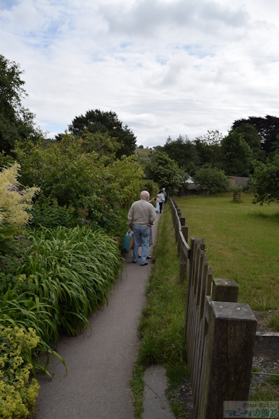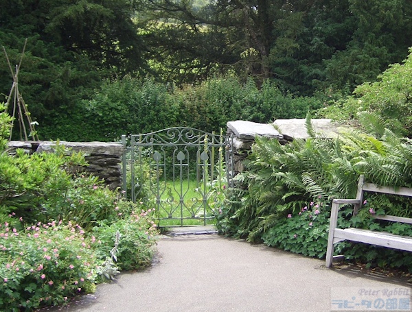 ▼ヒルトップ農場の家庭菜園エリアへ 続いて紹介するのは、家庭菜園の部分です。家庭菜園は、ヒルトップハウスの入口正面にアイアンゲートのある石垣で区切られた真四角のエリアです。 ![]() こちらは以前訪れた際に撮影した家庭菜園エリアにかかる緑色のアイアンゲート。私が以前ヒルトップ農場を訪れた際は、ヒルトップハウスが入場できる日は、目の前の菜園の中には入ることができず、ヒルトップハウスがクローズの日のみ、菜園に入場可能だった。そのため、目の前のアイアンゲートは閉じられ、菜園内から撮影は不可でした。 ![]() こちらがヒルトップ農場の家庭菜園エリア。人が立っているところがゲートのある入口で、緑色のアイアンゲートが開かれている。 ![]() 石垣の下に生えているハゴロモグサとシダは、自由に生えるがまま繁っているそう。 ▼挿絵にも描かれた「ビーボール」 オープンになった家庭菜園エリアは、ヒルトップハウス入場待ちの方や、私達のように見学を終えた方々が、途切れることなく出たり入ったり。 ![]() ビアトリクスが『あひるのジマイマのおはなし』を出版した頃は、ここをアヒルのジマイマたちが出たり入ったりしていたことでしょう。 ![]() この挿絵にも描かれた石垣に設置されている白い箱はミツバチの巣箱で、英国では雨や風を防ぐ実用的な方法として、石垣に巣箱を設置するように穴があいている。これらを「ビーボール(Bee-Bole)」と言い、湖水地方では特に多く見られるものです。 ビアトリクスは、ミツバチの群れを見つけ、ミツバチを捕まえる「Skep」という、これまた伝統的なワラで出来た丸籠を借り、ミツバチの群れの上に置き、巣箱へと誘導します。また、購入した巣箱の修理が必要だったことなど、1906年7月の手紙に書かれていました。 ![]() 『あひるのジマイマのおはなし』が出版された2年前に設置された巣箱が、こうしておはなしに描かれ、家庭菜園エリアでそのままの姿で見ることができる。また巣箱の手前は、ジマイマが卵を隠したルバーブが大きな葉をつけています。もちろん私もジマイマの卵を探したが見つからなかった。ジマイマは上手に隠すことができたのでしょう。 ![]() こちらは西洋ネギ(ボロネギ)。家庭菜園エリアは、ルバーブの他に、西洋ネギ(ボロネギ)、エンドウマメ、サヤインゲン、キャベツ、レタス、ジャガイモ、ニンジン、ラディッシュなど植えられている。 ![]() サヤインゲンは、木の枝で支柱を作り、地面の杭と支えの間に麻紐のロープをかけ、そこにツルをはわせていた。 ![]() こちらは家庭菜園エリアのもうひとつの出入口。前回訪れた際も、この出入口は開いていたものの、この先には進めなかった。 ▼農場エリアへ ![]() 次のエリアは農場エリア。ここから先は、高さ150pぐらいの石垣があり、プライベートで立入禁止となっている。この先は、1906年に建て増しされた建物の戸口のところに、『パイがふたつあったおはなし』に描かれた、おおよそ100年以上前の井戸があります。 ![]() ハンドルの位置が逆になっていますが、形状はほぼ一緒。『パイがふたつあったおはなし』より ![]() その先にある小屋は、『あひるのジマイマのおはなし』で、小屋内の様子(牛小屋の仕切りや手押し車など)が描かれ、さらにケップたちに助けられ戻ってくる場面で、この小屋の農場側より見た景色が描かれました。 ![]() 私達は、ジマイマ目線ではなく、ヒルトップハウス側からこの小屋を見ることができます。 ▼パドックエリアへ ![]() 最後は果樹園エリア。ヒルトップ農場への入場者数が増えたことにより、入り口より続くお花畑のエリアのダメージが大きくなり、人の行き来をスムーズに行えるようにあらたに設けられた小道の格子垣の向こう側が果樹園エリア。 ![]() 『あひるのジマイマのおはなし』より、ジマイマが庭からアヒルの丸焼きに使用するハーブ類とタマネギを探している場面で、背景に格子垣とそこにはわせているツルバラを描いている。 ![]() この格子垣の向こう側に広がるのは、囲いのあるパドックと呼ばれる牧草地で、そこにブラムリー(料理用のリンゴ)やダムソンプラム、洋梨などの果樹が植えられています。 ![]() こちらはパドックにある古木ブラムリー ヒルトップ農場の4つの異なるエリア、最初の小道の両側に広がるお花畑エリア、ヒルトップハウスの前にある家庭菜園エリア、ヒルトップハウスに1906年増築された部分より向こうに広がる農場エリア、そして小道の格子垣の向こう側にあるパドックと果樹園エリア、さらに果樹園の奥はジマイマの森へとつながっています。 ビアトリクスが生み出したキャラクターたちが、どこかでつながっているようにヒルトップ農場もそこかしこで今でも描かれたままの景色でつながり、私達に感動を与えてくれます。 ここまで、庭の見学だけで30分、ヒルトップハウス内見学と合わせて既に1時間が経過。予定をぎっしり詰め込んだツアー内容だったので、本当は一日ゆっ