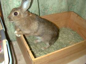 見た瞬間「かわいい」「ピーターラビットみたい」と思い、翌日、ケージ などそろえてから、買いにいったのです。 もちろん、子ウサギで、生後1ヶ月くらいは本当にかわいいですが、 あまりにも小さく思えて、しかも動物なんて、小学校以来だったので、 ちょっとこわいのもあり、ある程度体の大きかったこの子に決めました。 (それなりに知識もできたので今なら仔うさぎも平気ですが) |