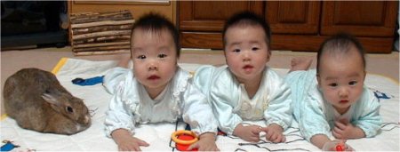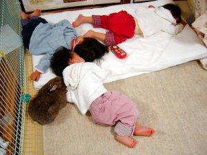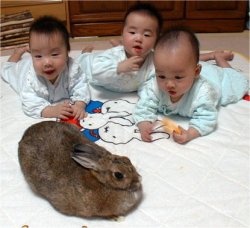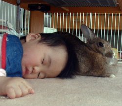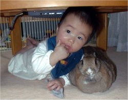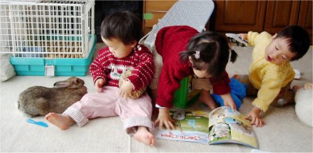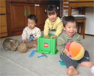 ![]() 赤ちゃんの成長もあっという間。3つ子ちゃん達も1歳9ヶ月となりました。 まだおしゃべりは始まっておりませんが、「ももちゃん」「もも」って呼んでます。 おでこを、うさぎの狭い額にくっつけて「好き、好き」っていうのもやります。 テレビに出てくる動物の画像や、近所を散歩中の犬も大好きな子供達に育ってくれてます。 ただ、「うさぎ」という単語と「もも」といううさぎの名前がよくわからないようで、「ももちゃんはうさぎなのよ」って理解できるのはまだもう少し先のようです。 ![]() みんなでお昼寝(グーグー)ももは5歳になりました。 このままずっと元気にと願わずにいられません。だってみんな家族ですものね。 |