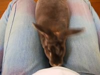 | 好きな食べ物は「パパイヤチップ」。 これの為なら、わが身をかえりみずに何でもします。 一度、高いところにしまっておいたら、猛烈なジャンプを繰り返し、頭をあちこちにぶつけてました…。それ以来、危険を避ける為に、冷蔵庫に保管される事となりました。 (でも、冷たいもの食べさせてはいけないんですよね…) |