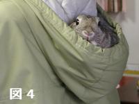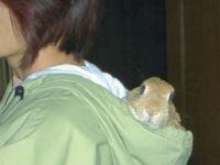 | 解説) きっかけは、スキー場に出かけたぷりんちゃんが、ゲレンデを散歩途中にするするとりえさんの肩にのぼって、フードの中に入ってしまったこと。 フードをぬぐと、「お手本」のようなスタイルになっていたとか。 寒さに強いとはいえ、氷点下の世界ではさすがにうさぎも寒いよね。 フードの中にすっぽり体がはまって、「これはぬくくていいや」なんて言わないけれど、この「お手本スタイル」決まってるでしょ。 そんなぷりんちゃんに続けーとばかりに、みんなも挑戦してみました。 まずは、トップバッター ぐぅ選手。 練習のせいかもあってか、まずまずのおさまりぐあいです。 耳もたたんで、顔だけひょこっとのぞかせる姿は 「う、うさぎには見えません(^^;) これでいいのでしょうか?ぷりん先生」(図1参照) 次は、ルルちゃん。 やだーすっぽりはまってる。 「あーもしもし、フードの中にすっぽりはまるのではなく、前足を肩にひっかけるのが正しい入り方です」 (えっへんとぷりん先生) 「それじゃーこれでどうですか?」となんとなくお手本スタイルに似てきたルルちゃん。(図2参照) 「なかなか筋がよろしい。その調子で修行しなさい」 。。ってもしもし(^^;) はい、お次は うさこちゃん。(図3参照) 「おやおや、顔の位置が反対ですね。それではすぐに落っこちてあぶないですよ。冬までに練習してくるように」 ときびしいぷりん先生よりひとことが。。(^^;)ないない はーい次はだあれ。むにゃむにゃお昼寝中のうさぎちゃんです。 「なによー眠いのにほっといて」むすー、プリプリ。不機嫌なうさぎちゃんです。(図4参照) なかなか安定感があっていいですね。その調子でがんばるよーに。 指導のぷりんちゃんもうさぎちゃんのご機嫌をそこねぬよう必死です。うんなぁーばかな(^^;) 最後は、マフィンちゃんです。 待ちくたびれて、先生この子寝ちゃいました。オロオロするマフィンママ まあいいから、いいから寝ている方がかえって暴れなくていいかも 「さすがー先生。マフィンは宙に浮いてるとも知らずに気持ちよさそうに寝てます。」(図5参照) 「目がさめてびっくりするといけないから、そっとおろしましょう」気遣いも忘れないぷりん先生なのだった。 先生のご指導が入ったので、冬までにみんなマスターできるかな。っておいおい。 (お手本の写真は、りえさんのホームページよりお借りしました。 このフードうさぎの写真は、2001年3月の日記をごらんくださいね。) りえさんのホームページ 注意)よい子のみんなは危ないから真似しないでね(^^;) |