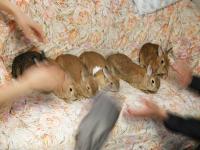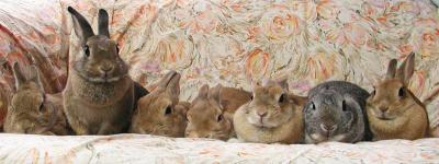 | 解説) 最後にみんなで記念撮影! 第1回の里帰りオフ会では、まず初めに全員で記念撮影したんだけど、大勢だから1秒だって一緒にくっついていたくないーって子ばかりで、シャッターが降りる頃には、てんでバラバラ。 何枚も撮影したのに、失敗せずに撮影できたのはたった1枚だけ。 今回もきっと大変だろうなーと思いつつ、一番最後に記念撮影に。 これが2回目ということもあるのか、それともえうさぎ達が少し疲れてきたのか、おとなしい。 みんなの体と体がくっついてあったかくなったのか、目をつぶって寝る子もでる始末。 でも仲悪い子もいるので、時々火花が飛び散る中(詳しくはプーママとうさぎの仲はを見てね)撮影は順調に進む。 とりあえずその辺にいた子から順番にソファーの上へ ぐぅはあきっぽい性格だから、すぐ移動しちゃう ![]() そこへプーママ参上!やっぱりママの貫禄あるよね。 ![]() ふぅーやっと全員集合。と思ったら、うさぎちゃん脱走。 ![]() ここで仕切りなおし。修正、修正。一時撮影中止。 実は黒子がこんなにもいたのだー(^^;) ![]() はい、よくできました! ![]() | ||