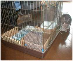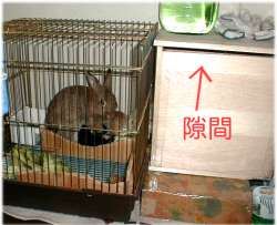 - プーちゃんの利用しているケージから行き来できるように作った産室。巣箱はうさぎの大きさに合わせて適切な大きさのものを用意してください。プーちゃんの場合(体重1500グラム)は30センチ四方のものを作りましたが、もっと大きなうさぎなら、さらに大きいものが良いでしょう。