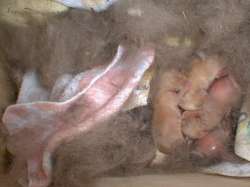 - 写真は生後三日目の仔うさぎです。出産のあとも、まだ毛が足りないようだとさらに毛を抜いて、仔うさぎが完全に毛の中に隠れるようにしていました。
