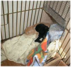 - プーちゃんは、産室からケージの巣箱に仔うさぎが出たときに、巣箱に落っこちてケガをしないように、産室に敷いていたタオルを引出し、産室とケージの間に通り道のようにしていました。