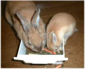 - お父さんのベンちゃんが食べる同じ餌を、仔うさぎも一緒になって食べています。(生後1ヶ月)