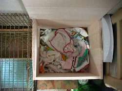 - 産室ができると、プーちゃんは巣材として布を欲しがりカーテンをやたら引っ張ったのでハンドタオルを与えたところ、口にくわえて産室に運び込みました。ハンドタオルを10枚ぐらい運び込み、産室に敷き詰めました。(出産の1週間ぐらい前です)